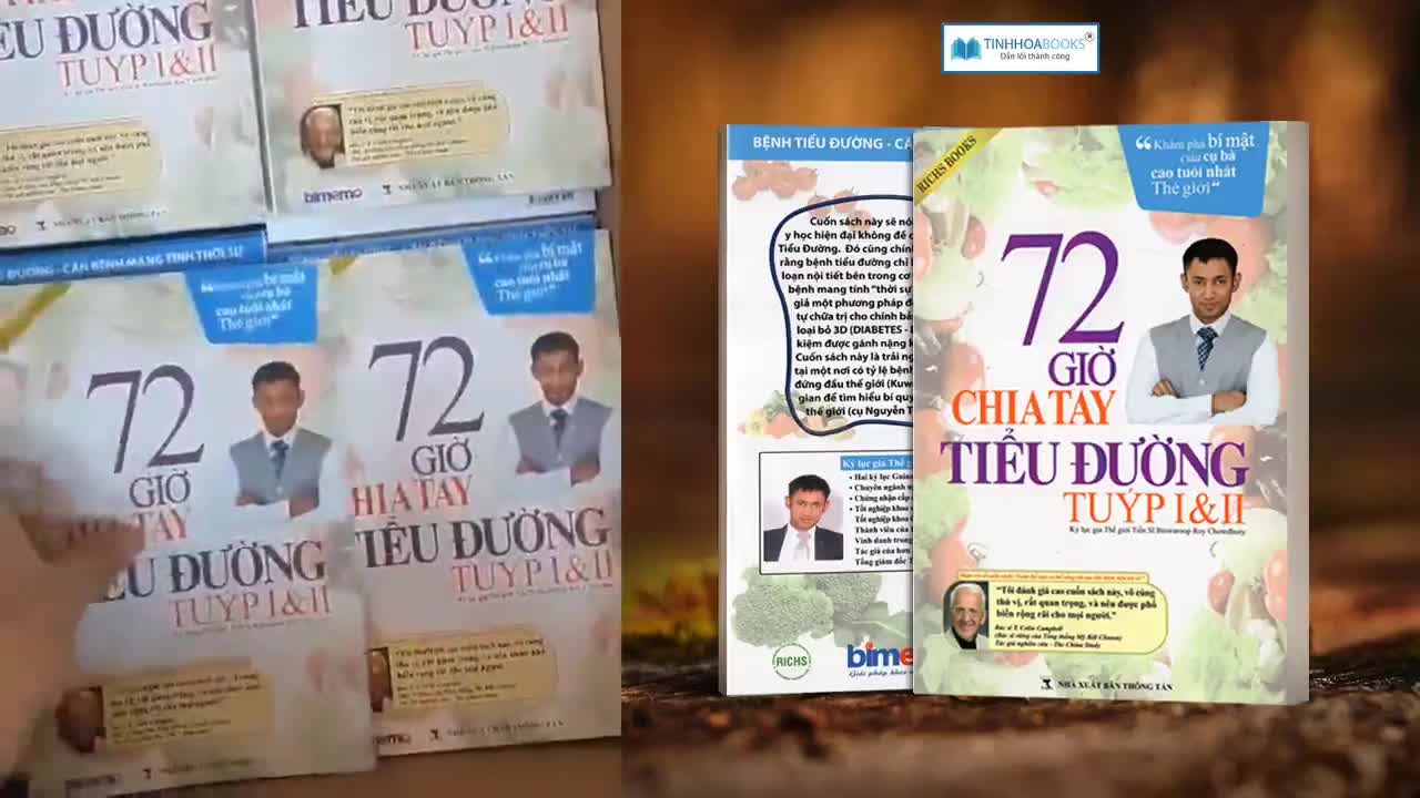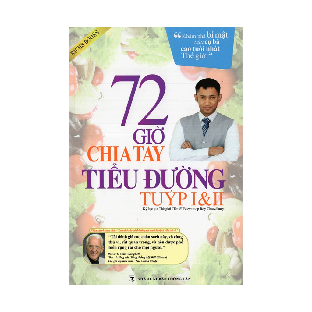 Thông tin sách 72 giờ chia tay tiểu đường: Tác giả: Biswaroop Roy Chowdhury Nhà xuất bản: NXB Thông Tấn Công ty phát hành: Bimemo Số trang: 141 Loại bìa: Bìa mềm Kích thước: 14*21.5 cm Nội dung sách: 72 giờ chia tay tiểu đường nói rõ hơn về những gì nền y học hiện đại không đề cập tới trong điều trị bệnh tiểu Đường. Đó cũng chính là nỗ lực để giải thích rằng bệnh Tiểu Đường chỉ là một phần của sự rối loạn nội tiết bên trong cơ thể nhưng chủ yếu là căn bệnh mang tính thời sự , cuối cùng trang bị cho độc giải một phương pháp đơn giản có thể giúp mỗi cá nhân tự chữa trị cho chính mình theo phương pháp loại bỏ 3D (Diabetes-Drugs-Doctors: Tiểu đường-thuốc-bác sĩ) đồng thời tiết kiệm được gánh nặng khổng lồ của nền kinh tế quốc gia. Cuốn sách có 9 chương bao gồm: Chương 1: Dành tặng cho người Việt Nam Chương 2: Bệnh Tiểu Đường – một bệnh lý mang tính thời sự Chương 3: Cách hiểu thông thường về bệnh Tiểu Đường Chương 4: Phía sau những tính toán khoa học Chương 5: Sự thật có thể chữa khỏi bệnh Chương 6: Có thể chữa khỏi Tiểu Đường tuýp II Chương 7: Chia tay Tiểu Đường tuýp I Chương 8: Chế độ ăn có thể chữa khỏi tiểu đường tuýp I & II Chương 9: Bài học từ cụ bà sống lâu năm nhất Thế Giới