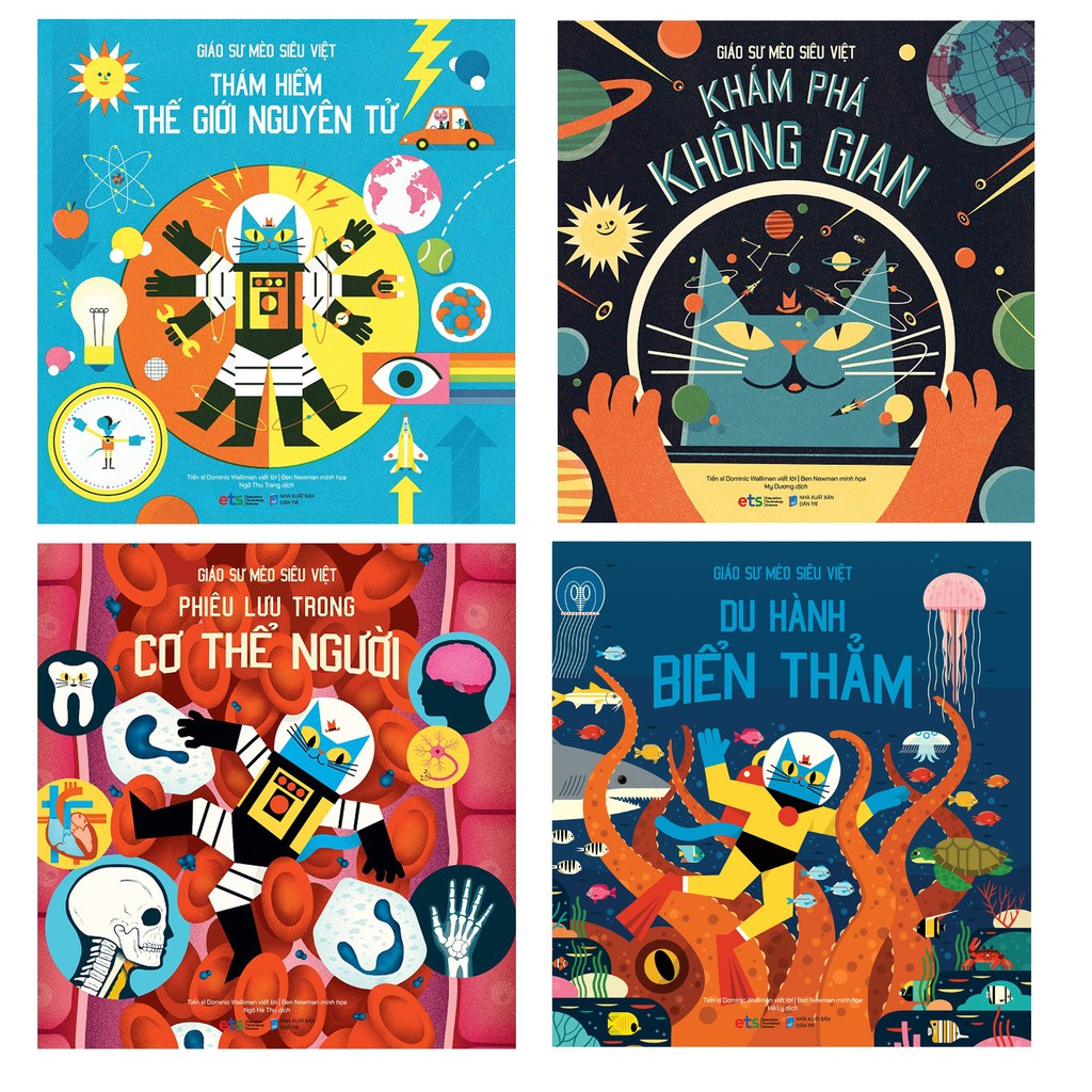 GIỚI THIỆU SÁCH Giáo sư Mèo Siêu Việt là bộ sách tranh gồm 04 cuốn, khai thác các chủ đề khoa học: đại dương, vật lý, cơ thể người và vũ trụ. Tuy khai thác mảng nội dung không quá mới mẻ nhưng nhờ hình thức truyền tải độc đáo, đây hứa hẹn là một bộ sách thực sự thu hút đối với độc giả nhí lứa tuổi tiểu học. Khoa học thường được cho là chủ đề “khô khan”, “khó nhằn”, không chỉ với trẻ nhỏ mà đôi khi với cả người lớn. Bộ Giáo sư Mèo Siêu Việt sử dụng hình ảnh sống động, màu sắc tươi sáng, cùng nét vẽ tinh nghịch, là những yếu tố hấp dẫn trước hết đối với con mắt trẻ nhỏ. Tin rằng sẽ không bạn nhỏ nào nhìn thấy những cuốn sách này mà lại không muốn kéo lại gần để tìm hiểu nội dung bên trong! Không chỉ vậy, xuyên suốt cả 04 cuốn đều xuất hiện nhân vật chính là Giáo sư Mèo cùng các đồng đội trong quá trình tham gia những hành trình khám phá. Lối dẫn dắt có nhân vật như một câu chuyện khiến bộ truyện có hồn hơn hẳn so với cách tiếp cận thường thấy là chỉ đưa ra các số liệu hay thông tin khô cứng. Sau khi đọc bộ sách này, hẳn sẽ không ít em nhỏ muốn “tự phong” cho mình làm giáo sư Mèo, hay ngài Mèo Astro, để tự mình giảng giải những kiến thức đã đọc cho các bạn hay các em của mình. Bởi trí tưởng tượng và niềm yêu thích đối với trò chơi phân vai luôn là đặc trưng ở lứa tuổi này! Trước khi đến với độc giả Việt Nam, bộ sách này đã được đón nhận ở không ít quốc gia, được dịch ra tới gần 20 thứ tiếng. Cuốn Phiêu lưu trong cơ thể người đã nhận đề cử Blue Peter Book Awards 2019 cho sách khoa học thiếu nhi xuất sắc nhất. Hay thậm chí Khám phá không gian còn được khai thác sâu hơn thành game điện thoại “Professor Astro Cat’s Solar System”. Đây là những thành công và độ phổ biến mà hẳn cuốn sách nào cũng mong muốn đạt được. Về nội dung, bộ sách khai thác những phạm vi kiến thức ở mức cơ bản nhất ở mỗi chủ đề; diễn giải đơn giản, dễ hiểu, phù hợp việc tạo dựng nền hiểu biết cho các độc giả nhí lứa tuổi tiểu học. Nội dung chính ở từng cuốn như sau: – Khám phá không gian: sự hình thành sao; thông tin khái quát về Mặt Trời, Mặt Trăng, Trái Đất và các hành tinh trong Hệ Mặt Trời; hoạt động du hành vũ trụ; sự sống trong vũ trụ – Du hành biển thẳm: sự hình thành đại dương; các nhóm động-thực vật biển tiêu biểu; đặc điểm của từng vùng nước (chia theo độ sâu); các vấn đề đối với biển hiện nay – Thám hiểm thế giới nguyên tử: các quy luật cơ bản của vũ trụ; các quy tắc cơ bản mô tả bản chất của thế giới xung quanh chúng ta – Phiêu lưu trong cơ thể người: khái quát về cơ thể sống; tế bào; các hệ cơ quan Đặc biệt, ở mỗi cuốn sách, tác giả đều không chỉ đưa ra nội dung kiến thức thông thường mà còn gửi gắm những lời nhắn nhủ về các vấn đề như sự ô nhiễm biển, chế độ ăn uống… hay đề cập đến các lĩnh vực mà chính các em nhỏ cũng có thể tự tìm hiểu khi lớn lên (tương lai của du hành không gian và khoa học nghiên cứu/phát triển cơ thể con người, những kiến thức rộng mở của thế giới vật lý…), khiến bộ sách có tính gợi mở, thôi thúc trí tò mò và sự đam mê tìm hiểu ở các độc giả nhí. Mà, sách cho những mầm non của tương lai thì còn điều gì cần hơn thế? —————————————– Công ty phát hành Alphabooks Tác giả Tiến sĩ Dominic Walliman Nhà xuất bản NXB Dân Trí Số trang 71/ cuốn Năm XB 2021 Loại bìa Bìa cứng
