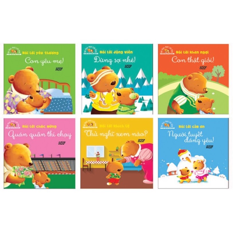 Gấu con trong lúc vội vàng đã xỏ nhầm hai chiếc tất khác màu, cài lệch cúc áo, đi một chiếc giày… Khi được bà nội nhắc nhở, cậu ấy đã kịp thời phát hiện những lỗi sai của mình và sửa lại, sau đó vui vẻ đến trường. Các bé nhớ nhé: Khi làm sai việc gì, nhận được sự nhắc nhở, khích lệ của mọi người, bé sẽ nhanh chóng sửa sai được thôi. Gấu anh trượt băng rất nhanh và đẹp mắt. Gẫu con cũng muốn trượt như anh, nhưng cậu toàn bị ngã sõng soài, sợ quá, cậu không dám tập tiếp. Gấu anh liền động viên, giúp em tập từng chút, từng chút một. Và sau một thời gian, Gấu con đã có thể trượt băng một mình rồi. Các bé nhớ nhé: Những lúc sợ hãi, nếu nhận được sự động viên từ mọi người, nhất định bé sẽ tự tin trở lại. Mỗi cuốn sách đều có kèm sticker để các bé vừa học vừa chơi Bộ sách bé học nói lời hay gồm 6 cuốn: 1. Bé học nói lời hay – Nói lời cảm ơn – Người tuyết đáng yêu! 2. Bé học nói lời hay – Nói lời yêu thương – Con yêu mẹ! 3. Bé học nói lời hay – Nói lời chúc mừng – Quán quân thi chạy 4. Bé học nói lời hay – Nói lời động viên – Đừng sợ nhé! 5. Bé học nói lời hay – Nói lời khích lệ – Thử nghĩ xem nào? 6. Bé học nói lời hay – Nói lời khen ngợi – Con thật giỏi! Tác giả: Mễ Cát Khả/ Tranh: Tôn Triết Dịch giả: Hà Giang NXB Thanh Niên Độ tuổi: 0-6 Kích thước: 19.6×20.5 Năm xuất bản: 2018 Số trang: 20 Cảm ơn bạn đã ghé qua tiệm sách Minh Vân. Chúc một ngày tốt lành! #sachthieunhi #sachbanchay #sachmamnon #sachbanchay #behocnoiloihay #noiloicamon #noiloiyeuthuong #noiloidongvien #noiloichucmung #noiloikhichle #noiloikhenngoi