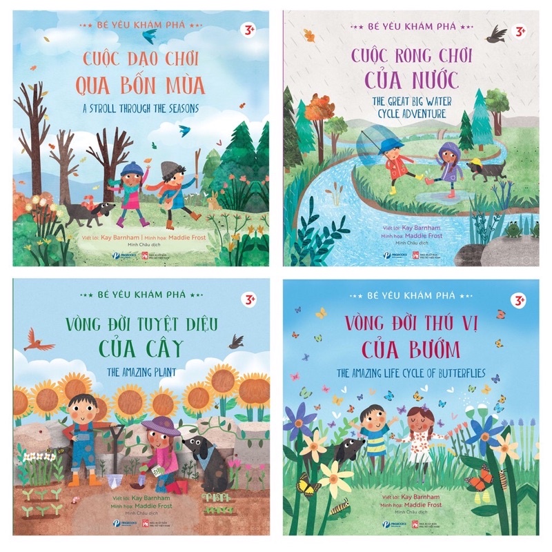 Sách – Bé Yêu Khám phá phần 1-2- trọn bộ 4 cuốn ebook pdf review dowload tác giả , Danh Mục Truyện Tranh Kho hàng 29 . BÉ YÊU KHÁM PHÁ – VÒNG ĐỜI TUYỆT DIỆU CỦA CÂY Cuốn sách này sẽ giúp các bạn nhỏ hiểu được sự phát triển của cây xanh từ khi còn là hạt giống đến lúc cây trưởng thành, biết được các quá trình phát triển của cây, không những vậy cuốn sách còn giúp các bạn nhỏ thêm yêu thiên nhiên và môi trường nữa đấy. BÉ YÊU KHÁM PHÁ – CUỘC DẠO CHƠI QUA BỐN MÙA Các bạn nhỏ sẽ được đi dạo qua các mùa để cảm nhận sự thay đổi của thời tiết, ngắm những bông hoa mùa xuân rực rỡ đến những chiếc lá mùa thu đầy màu sắc, theo dõi những thay đổi tuyệt vời mà mỗi mùa mang lại. Cuốn sách được minh họa đẹp mắt này cho thấy thiên nhiên rực rỡ của cây xanh mùa xuân, ánh nắng chói chang của mùa hè, lá mùa thu rực rỡ và tuyết mùa đông lấp lánh. Hãy cùng theo dõi hành trình của các bạn nhỏ khi họ đi qua gió, mưa, nắng và tuyết để khám phá những thay đổi tuyệt vời mà mỗi mùa mang lại nhé! BÉ YÊU KHÁM PHÁ – CUỘC RONG CHƠI CỦA NƯỚC Cuốn sách này sẽ đưa bé đến với câu chuyện thú vị về vòng tuần hoàn của nước. Giúp bé hiểu sâu về hành trình của nước không hề bị mất đi mà nó di chuyển vòng quanh trái đất một cách lặp đi lặp lại. Từ hơi nước ngưng tụ thành những giọt nước, thành đám mây , rồi những hạt mưa xuất hiện, nước mưa rơi vào ao, hồ, sông, suôi và đổ ra biển, sau đó vòng tuần hoàn nước lại bắt đầu… BÉ YÊU KHÁM PHÁ – VÒNG ĐỜI THÚ VỊ CỦA BƯỚM đây là một cuốn sách vô cùng hấp dẫn cho các bé bắt đầu tìm hiểu thế giới động vật, bởi Bướm là loài côn trùng ẩn giấu nhiều điều thú vị trong vòng đời. Từ quá trình sinh trưởng và phát triển của loài bướm là một vòng tuần hoàn khép kín đầy thu hút. Hãy cùng theo dõi cuộc hành trình của các bạn nhỏ qua cuộc phiêu lưu khám phá những điều kì diệu về loài bướm trong cuốn sách này bé nhé! Tác giả: Kay Barnham, Maddie Frost Dịch giả : Minh Châu NXB: nxb Phụ Nữ Việt Nam Số trang: 30 trang/Cuốn Khổ sách: 20,5×20,5 cm Độ tuổi : 3+ Năm xuất bản: Tháng 4/2021