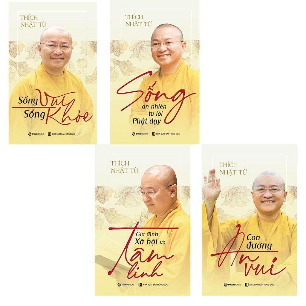 BỘ SÁCH 4 CUỐN THẦY THÍCH NHẬT TỪ Công ty phát hành: SaigonBooks <01> SỐNG AN NHIÊN TỪ LỜI PHẬT DẠY Trong quyển sách Sống an nhiên từ lời Phật dạy, Thầy Thích Nhật từ chia sẻ MƯỜI BỐN ĐIỀU PHẬT DẠY VÀ MƯỜI ĐIỀU TÂM NIỆM. Đây là những triết lý sâu sắc về tu tập đại hạnh, mang đến cái nhìn minh triết không chỉ dành riêng cho Phật tử mà dành cho cả người vô thần hoặc người thuộc các tôn giáo khác để tất cả chúng ta đều có thể có được bình an thật sự trong cuộc sống quá bon chen này. Chúng ta không nên học thuộc lòng hay áp dụng những điều này một cách máy móc, mà hãy quán chiếu thường xuyên để tâm tỉnh thức và không bị nghiệp chướng chi phối. Hãy luôn tâm niệm chúng để nâng cao năng lực hành trì và gia tăng sự tập trung vào những mục đích cao thượng, tốt đẹp để có thể chế tác lợi lạc, an vui. — Mã sản phẩm: 8935278606208 Nhà xuất bản: NXB Hồng Đức Kích thước: 13 x 20.5 cm Số trang: 220 Năm phát hành 2021 <02> SỐNG VUI SỐNG KHỎE Đức Phật đã dạy: Sức khỏe là tài sản lớn nhất của đời người. Ở đây, sức khỏe mà Ngài nói đến không chỉ là sức khỏe thể chất mà còn là sức khỏe tinh thần. Vậy nên, trong quyển sách Sống vui sống khỏe này, tôi sẽ chia sẻ với quý bạn đọc những kinh nghiệm và kiến thức của bản thân tôi, dựa trên khoa học và chân lý Phật giáo, hy vọng có thể giúp bạn đọc sống vui, sống khỏe. Sức khỏe thể chất và sức khỏe tinh thần đều quan trọng như nhau, không có cái nào quan trọng hơn cái nào. Có khỏe mới vui, có vui mới khỏe. Đạo Phật không khuyến khích các hình thức mê tín dị đoan. Không có Thần thánh, Thượng Đế nào quyết định thành công, sức khỏe, trí tuệ… của chúng ta cả. Nhân thế nào thì quả thế nấy, tất cả đều phụ thuộc vào quá trình nỗ lực dựa trên tuệ giác, nương theo con đường chính đạo của mỗi người. Để có thể sống vui sống khỏe, không phải chỉ cầu nguyện, mong ước là được, mà mỗi chúng ta đều phải cố gắng rèn luyện cơ thể cũng như chuyển hóa được tham-sân-si trong tâm mình. Mã sản phẩm: 8935278605683 Nhà xuất bản: NXB Hồng Đức Kích thước: 13 x 20.5 cm Số trang: 204 Năm phát hành 2021 <03> CON ĐƯỜNG AN VUI Có phải, suốt cuộc đời, tất cả chúng ta đều đi tìm hạnh phúc? Theo cách hiểu của đa số chúng ta, hạnh phúc là mọi sự được như ý, là bản thân có được tất cả những mong cầu. Nhưng những thứ ấy có thật sự bền vững, lâu dài? Theo Phật giáo, an lạc mới là hạnh phúc lớn nhất và tồn tại lâu dài nhất. An lạc không phải là điều mong là sẽ đến, cầu là sẽ được, mà là kết quả của cả một quá trình tu tập để đạt được tuệ giác, hiểu thấu được khái niệm buông xả và chặt đứt được tất cả những si mê, sân hận trong lòng. Hành trình đến với an lạc là một hành trình dài và không hề dễ dàng. Nhưng những con đường bằng phẳng thường không dẫn ta đến đích vinh quang. Tu tập cũng vậy. Nếu không gặp những điều bất như ý, không gặp chướng duyên hay nghịch cảnh thì chúng ta không thể nào giác ngộ và đến được Cực Lạc. Đó là lý do tôi viết nên quyển sách Con đường an vui này – một quyển sách nói về hành trình tìm đến an vui dài lâu. Có thể những chia sẻ này chưa thực sự đầy đủ và trọn vẹn để trở thành cơ sở giúp một người có thể thực tập và đạt đến an lạc được ngay. Mã sản phẩm: 8935278605768 Nhà xuất bản: NXB Hồng Đức Kích thước: 13 x 20.5 cm Số trang: 216 Năm phát hành 2021 <04> GIA ĐÌNH, XÃ HỘI VÀ T.LINH Phần kinh Thiện Sanh trong kinh Trường A Hàm là cẩm nang về đạo làm người, thể hiện tinh thần nhập thế của Phật giáo qua các quan niệm về cá nhân, gia đình và xã hội của Đức Phật, đề cập đến đời sống lành, đời sống hạnh phúc, đời sống có văn hóa và những giá trị tương quan thiêng liêng nhất của kiếp người. Đạo Phật không khuyến khích các hình thức tự cô lập hay tự tách rời bản thân khỏi các mối tương quan xã hội, vì như thế là chúng ta đã đánh mất cơ hội tiếp nhận những điều hay mà cuộc đời và người khác ban tặng, đồng thời cũng không thể thiết lập ảnh hưởng tích cực đến tha nhân. Tương quan trong gia đình là các mối quan hệ quan trọng nhất đối với bất kỳ ai. Tương quan vợ chồng là điểm xuất phát của gia đình, và sau một thời gian chung sống, người vợ và người chồng sẽ trở thành cha, mẹ – tương quan giữa cha mẹ và con cái từ đó bắt đầu xuất hiện. Thế nên, Đức Phật đã đưa ra những lời dạy về đạo làm chồng – làm vợ, đạo làm cha mẹ – con cái, sao cho chúng ta có thể xây dựng được một gia đình ấm êm, hạnh phúc. Mã sản phẩm: 8935278605676 Nhà xuất bản: NXB Hồng Đức Kích thước: 13 x 20.5 cm Số trang: 252 Năm phát hành 2021