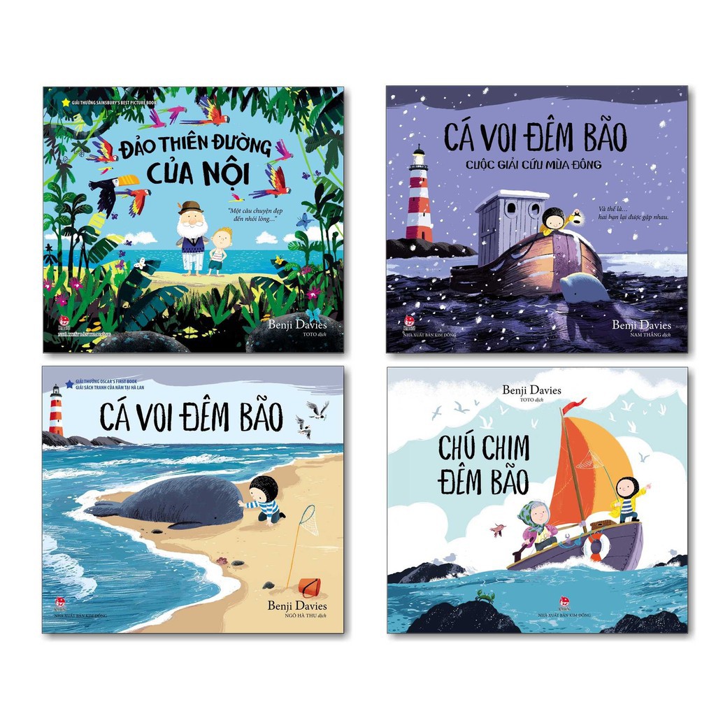 Những câu chuyện cảm động và đầy ý nghĩa về tình bạn, tình cảm gia đình, tình yêu thiên nhiên… được thể hiện bằng màu sắc và đường nét tuyệt đẹp. Các tác phẩm trong tuyển tập đều giành được những giải thưởng danh giá của nhiều quốc gia trên thế giới. Boxset Cá Voi Đêm Bão Và Những Câu Chuyện Khác… gồm 4 cuốn: 1. Chú chim đêm bão 2. Cá voi đêm bão 3. Cá voi đêm bão – Cuộc giải cứu mùa đông 4. Đảo thiên đường của nội Chú chim đêm bão Cậu bé Nim chưa thực sự sẵn sàng cho kì nghỉ hè ở hòn đảo của bà. Nhưng rồi cậu sẽ nhanh chóng được cuốn vào một cuộc “giải cứu” ngoạn mục đánh dấu sự khởi đầu của một tình bạn đầy xúc động… Cá voi đêm bão Dịu dàng và ấm áp… Câu chuyện đầy rung cảm về tình bạn giữa một chú cá voi dạt bờ và một cậu bé cô đơn… được sáng tác bởi một tài năng xuất chúng. Cá voi đêm bão – Cuộc giải cứu mùa đông Hè năm ngoái, cậu bé Nim đã “giải cứu” một bạn cá voi bé bị bão đánh dạt vào bờ. Năm nay, khi mùa đông tràn về muôn nẻo, em lại ước ao được gặp lại người bạn đáng yêu của mình lần nữa… Đảo thiên đường của nội “Một câu chuyện đẹp đến nhói lòng…” Fin rất yêu quý Nội, và Nội cũng yêu thương Fin vô cùng. Tình cảm ấy sẽ chẳng bao giờ đổi thay. Một cuốn sách tuyệt đẹp và cảm động với lời nhắn nhủ: “Những người thân yêu sẽ luôn gần bên ta, dù họ có cách ta bao xa chăng nữa.” Nhà Cung Cấp: Nhà Xuất Bản Kim Đồng Tác giả: Benji Davies NXB: NXB Kim Đồng Năm XB: 2020 Ngôn Ngữ: Tiếng Việt Trọng lượng (gr): 720 Kích thước: 25 x 22 cm Hình thức: Bìa Mềm số trang: 150