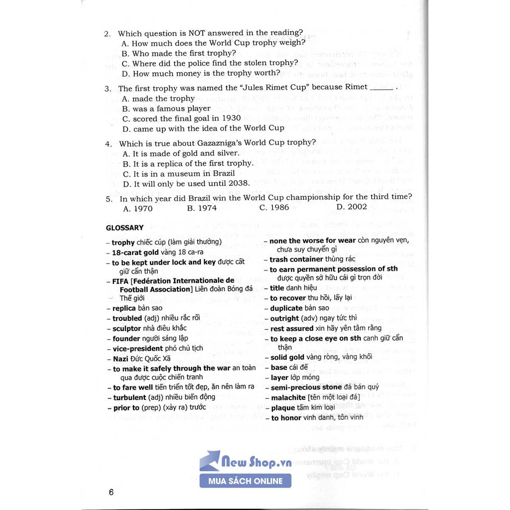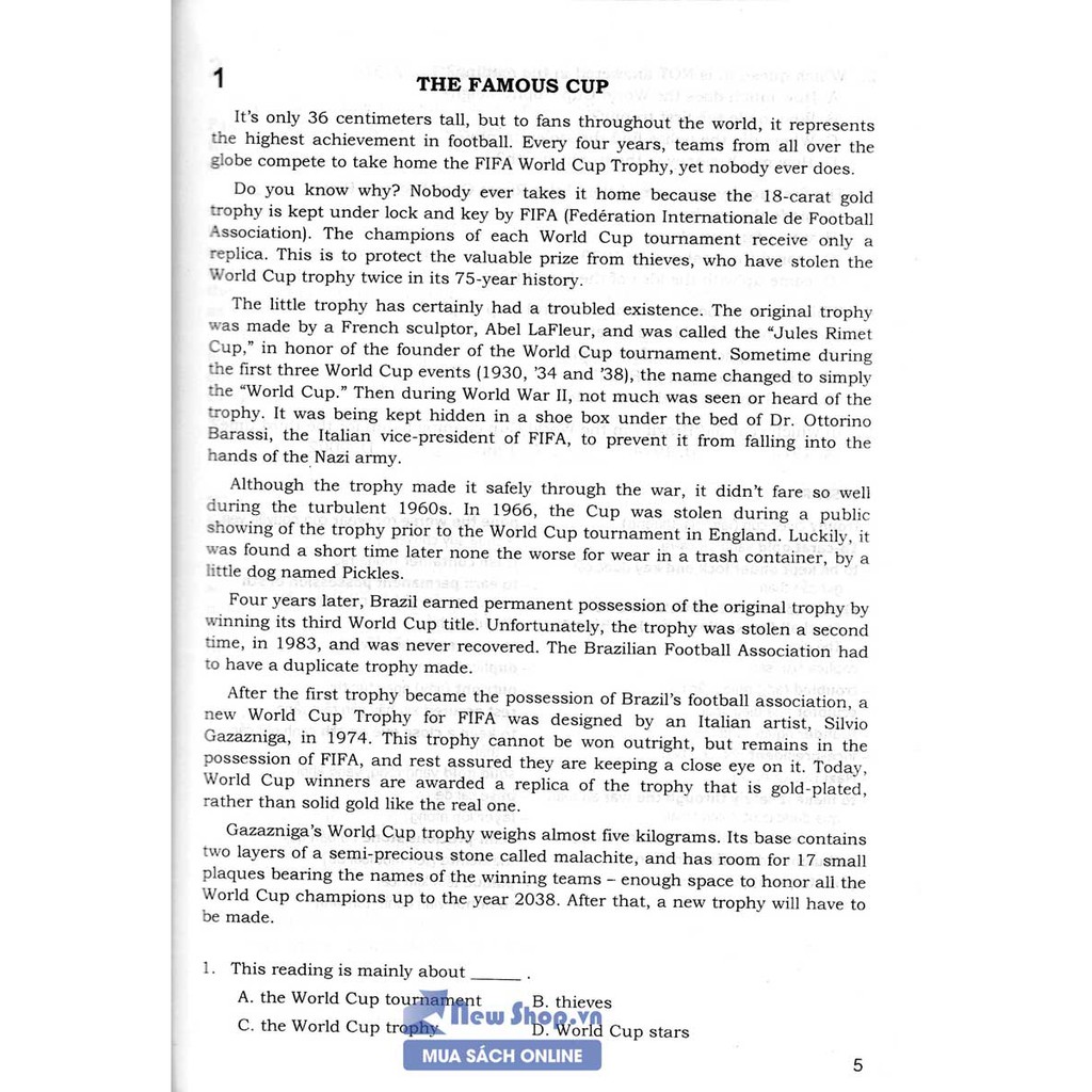 Câu Hỏi Trắc Nghiệm Chuyên Đề Kỹ Năng Đọc Hiểu Tiếng Anh Câu hỏi trắc nghiệm dưới mỗi bài đọc thường gồm các loại sau : 1. Câu hỏi về ý chính : Yêu cầu người đọc phải tóm tắt được chủ đề cơ bản hoặc mục đích của tác giả ,với các dạng mở đầu . Để chọn được câu trả lời đúng,học sinh nên : (1) Lưu ý đến câu chủ điểm (thường nằm ở đầu mỗi đoạn văn) (2) Lưu ý giọng văn của tác giả. (3) Đọc lướt qua toàn bài ,đặc biệt là câu chủ điểm ,để tìm những từ ngữ mấu chốt có thể biểu thị thái độ của tác giả đối với đề tài . (4) Đọc kĩ bài để chọn câu trả lời đúng.Lưu ý rằng chỉ câu chủ điểm không thôi chưa đủ thông tin để xác định ý chính của bài. Ý chính chỉ có thể được khái quát hóa sau khi đọc kỹ toàn bài và theo dõi thái độ của tác giả. 2.Câu hỏi về sự kiện.Loại câu hỏi này yêu cầu học sinh phải trả lời bằng các thông tin cụ thể về bài văn. Câu hỏi về sự kiện có dạng là một câu bỏ lửng và bên dưới là 4 chọn lựa ,trong đó chỉ có một chọn lựa hoàn thành câu bỏ lửng và bên dưới là 4 chọn lựa ,trong đó chỉ có một chọn lựa hoàn thành câu bỏ lửng đúng ý bài văn. Để chọn đúng câu trả lời cho lại câu hỏi này ,học sinh cần : (1) Xác định từ/cụm từ mấu chốt trong câu hỏi. (2) Lướt qua bài văn để tìm được vị trí của từ/cụm từ mấu chốt trong bài văn,đọc kĩ phần bài văn có chứa cụm từ này để chọn câu trả lời. 3. Các câu hỏi và sự kiện phủ định: Đưa ra 3 phát biểu đúng và một phát biểu sai.Học sinh phải loại trừ được 3 phát biểu đúng, phát biểu sai còn lại là câu trả lời . Để trả lời các câu hỏi sự kiện phủ định ,học sinh phải : (1) Đọc kĩ các chọn lựa để xác định vị trí của thông tin trong bài văn. (2) Đọc lướt qua bài văn để loại trừ 3 chọn lựa có thông tin khớp với thông tin trong văn bản (3) Chọn lựa còn sót lại chính là câu trả lời đúng. 4. Câu hỏi suy luận : Thông tin để trả lời loại câu hỏi này đôi khi không được phát biểu rõ ràng trong bài văn.Học sinh phải suy luận căn cứ trên những thông tin khác,hoặc phải “đọc giữa hai hàng chữ ” mới thấy ý ẩn tàng của tác giả. 5. Câu hỏi về ngữ pháp : Loại câu hỏi này trắc nghiệm vốn từ vựng của học sinh.Học sinh phải chọn trong 4 từ cho sẵn một từ đồng nghĩa với các từ dùng trong bài văn. ————————————————————- Tác Giả: Vĩnh Bá Số Trang: 328 Năm Xuất Bản: 2020