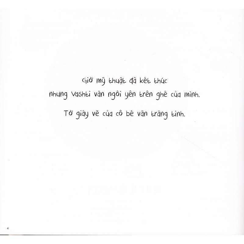 Công ty phát hành Thái Hà Books Tác giả: Peter H. Reynolds ( Thái Hà Books dịch ) Ngày xuất bản 01-2017 Kích thước 21.5 x 20 cm Nhà xuất bản NXB Lao Động Số trang 32 GIỚI THIỆU SÁCH Bộ Ehon Kích Thích Nguồn Cảm Hứng, Sáng Tạo Của Trẻ: Dấu Chấm Trong lớp học vẽ, khi cả lớp đều hoàn thành bài vẽ mỹ thuật của mình, riêng tờ giấy vẽ của Vashti vẫn trắng tinh. Cô giáo mỹ thuật tiến lại gần Vashti, mỉm cười và thốt lên: “A! Là một bạn gấu trắng trong bão tuyết!”, Vashti bực dọc thốt lên “Vui quá cô ha, con không thể vẽ được” . Rồi chỉ vài câu gợi ý, Vashti đã mạnh dạn lấy hộp màu chưa bao giờ dung, chẳng mấy chốc đã tạo ra một phòng triển lãm tranh “dấu chấm” vô cùng sinh động: