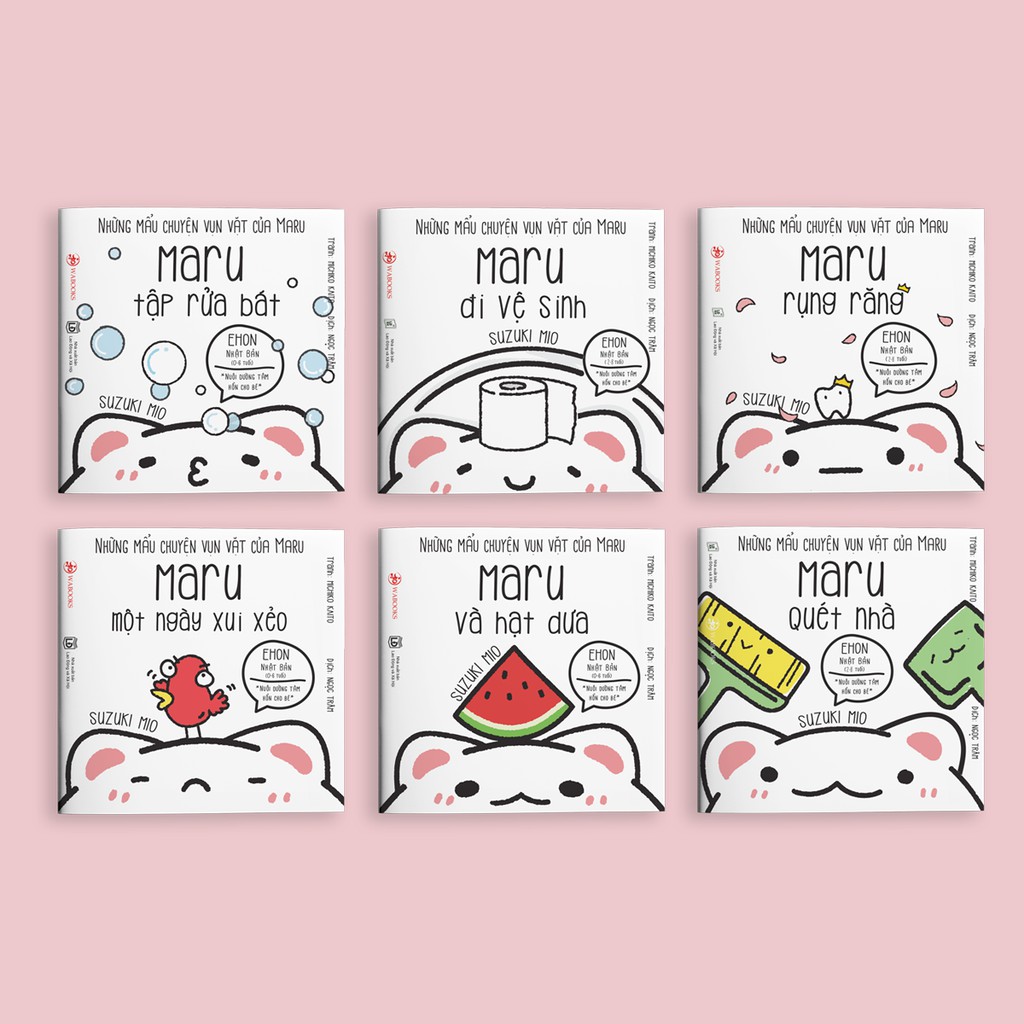 Bộ sách xoay quanh những câu chuyện vụn vặt của bạn mèo có tên là Maru. Bạn mèo Maru không những rất tự lập, mà còn có tư duy biết quan sát những sự vật sự việc xung quanh một cách rất hóm hỉnh và đáng yêu, kèm theo sự thay đổi tâm lý, tính cách của con trong giai đoạn con dần trưởng thành và bắt đầu đến trường. Qua hình ảnh bé Maru, chính các con cũng nhen nhóm lên được ý thức muốn tự lập, tư duy quan sát, và biết chia sẻ với mọi người xung quanh…. Maru rụng răng: Câu chuyện về việc bạn Maru có cái răng lung lay sẽ tập cho các bé thói quen tự giác chăm sóc vệ sinh răng miệng hàng ngày và nỗi sợ đối với việc thay răng cũng sẽ biến thành một niềm tự hào đối với bé. NXB Lao Động Xã Hội Tác giả Suzuki Mio Ngày xuất bản 09-2018 Kích thước 21 x 20 cm Số trang 24 Maru một ngày xui xẻo: Cuốn sách hướng dẫn bé tự tin đứng lên sau mỗi lần không gặp may và suy nghĩ về những điều tích cực. Đồng thời, cuốn sách dạy bé biết đồng cảm và yêu thương, giúp đỡ người khác. NXB Lao Động Xã Hội Tác giả Suzuki Mio Ngày xuất bản 09-2018 Kích thước 21 x 20 cm Số trang 24 Maru và hạt dưa: Cuốn sách tiết lộ suy nghĩ ngây thơ, ngộ nghĩnh và đầy sáng tạo của Maru về hạt dưa hấu. Maru sẽ dạy các bé cách trồng và chăm sóc cây, từ đó nuôi dưỡng ý thức về cây trồng xung quanh bé. NXB Lao Động Xã Hội Tác giả Suzuki Mio Ngày xuất bản 09-2018 Kích thước 21 x 20 cm Số trang 24 Maru đi vệ sinh: Cuốn sách đáng yêu này sẽ dạy cho bé hình thành tư duy tự giác khi mẹ đang bận và kích thích khả năng chủ động của bé trong các công việc sinh hoạt đơn giản hàng ngày. NXB Lao Động Xã Hội Tác giả Suzuki Mio Ngày xuất bản 09-2018 Kích thước 21 x 20 cm Số trang 24 Maru quét nhà: Thông qua việc bạn Maru quét nhà, cuốn sách đóng vai trò hình thành nên thói quen giữ gìn vệ sinh chung và sống ngăn nắp, gọn gàng trong trẻ nhỏ. NXB Lao Động Xã Hội Tác giả Suzuki Mio Ngày xuất bản 09-2018 Kích thước 21 x 20 cm Số trang 24 Maru tập rửa bát: Cuốn sách là câu chuyện về việc bạn Maru tư giác giúp đỡ mẹ rửa bát và nghịch ngợm khi nhìn thấy những quả bóng bay từ nước xà phòng tạo nên. NXB Lao Động Xã Hội Tác giả Suzuki Mio Ngày xuất bản 09-2018 Kích thước 21 x 20 cm Số trang 24 ***************** #ehon #ehon_nhật_bản