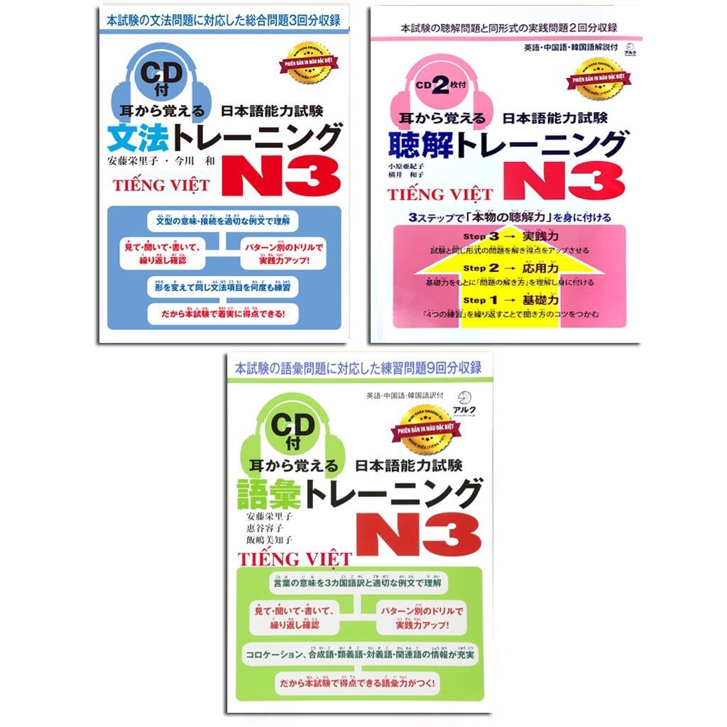 Giới thiệu chung về sách: Giới thiệu sách: Trọn bộ 3 cuốn in phiên bản dịch tiếng việt Có kèm cd Mimi kara oboeru N3 – Toreningu N3 bao gồm 3 cuốn chuyên về 3 kỹ năng Ngữ pháp, Từ vựng và Nghe hiểu (kỹ năng Đọc hiểu và Hán tự vẫn chưa được xuất bản) với các bài học được phần theo nhóm kèm theo nhiều bài tập và đáp án đầy đủ sẽ là bộ sách vô cùng hữu ích giúp bạn nắm vững kiến thức đề thi năng lực Nhật ngữ N3 một cách nhanh chóng và hiệu quả. Mimi kara oboeru N3 – Toreningu N3 bao gồm: 1. 耳から覚える日本語能力試験語彙トレーニングN3 – Gồm 12 chương chia theo từ loại: danh từ, động từ, tính từ, trạng từ… – Phần bài học có từ vựng, nghĩa tiếng Anh, từ đồng nghĩa, từ trái nghĩa, ví dụ minh họa, đàm thoại thông thường và hình ảnh minh họa. – Phần bài tập nằm ở cuối mỗi bài và cuối mỗi chương, nội dung đa dạng phong phú và đáp án đầy đủ. Thông tin cơ bản về sách: Nhà xuất bản: Nxb Trẻ Năm xuất bản: 2017 Tác giả : Nhiều tác giả Công ty phát hành: Nxb Trẻ Số trang: 200 Ngôn ngữ: Tiếng Nhật tiếng Việt Trọng lượng: 300g Loại bìa: Bìa mềm 2. 耳から覚える日本語能力試験文法トレーニングN3 – Gồm 10 chương, mỗi chương tổng hợp nội dung của từ 8-13 mẫu ngữ pháp – Phần bài học bao gồm: ôn lại ngữ pháp sơ cấp của N4 và N5, cung cấp nghĩa, cấu trúc, ví dụ và những cách dùng đặc biệt – Phần bài tập cuối mỗi chương (gồm nghe và ngữ pháp), sau 3-4 chương sẽ có bài tập tổng hợp và cuối sách có 3 bài tập tổng kết toàn bộ ngữ pháp N3 Thông tin cơ bản về sách: Nhà xuất bản: Nxb Trẻ Năm xuất bản: 2017 Tác giả : Nhiều tác giả Công ty phát hành: Nxb Trẻ Số trang: 200 Ngôn ngữ: Tiếng Nhật tiếng Việt Trọng lượng: 300g Loại bìa: Bìa mềm 3. 耳から覚える日本語能力試験聴解トレーニングN3 – Gồm 5 chương, mỗi chương 4-5 bài và mỗi bài chia theo kỹ năng – Phần bài học gồm phần hướng dẫn, luyện tập và ví dụ – Phần bài học nằm cuối mỗi bài. Đặc biệt, cuối sách có 2 đề thi mẫu được biên soạn theo đề thi thực tế. Tất cả đều có đáp án, nội dung nghe và giải thích tiếng Anh đầy đủ. ————————————— Thông tin cơ bản về sách: Nhà xuất bản: Nxb Trẻ Năm xuất bản: 2017 Tác giả : Nhiều tác giả Công ty phát hành: Nxb Trẻ Số trang: 200 Ngôn ngữ: Tiếng Nhật tiếng Việt Trọng lượng: 300g Loại bìa: Bìa mềm