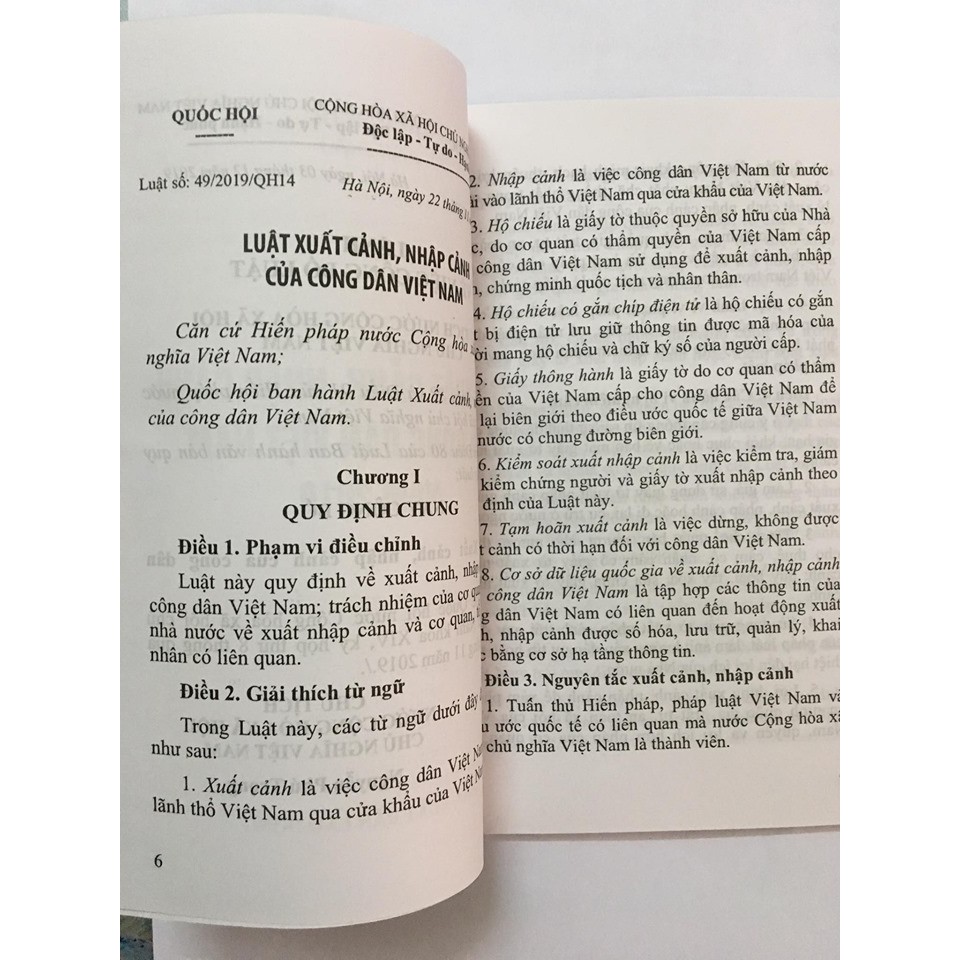 Luật Xuất cảnh, nhập cảnh của công dân Việt Nam Căn cứ Hiến pháp nước Cộng hòa xã hội Chủ nghĩa Việt Nam; Quốc hội ban hành Luật Xuất cảnh, nhập cảnh của công dân Việt Nam. Phạm vi điều chỉnh Luật này quy định về xuất cảnh, nhập cảnh của công dân Việt Nam; trách nhiệm của cơ quan quản lý nhà nước về xuất nhập cảnh và cơ quan, tổ chức, cá nhân có liên quan. Giải thích từ ngữ Trong Luật này, các từ ngữ dưới đây được hiểu như sau: 1. Xuất cảnh là việc công dân Việt Nam ra khỏi lãnh thổ Việt Nam qua cửa khẩu của Việt Nam. 2. Nhập cảnh là việc công dân Việt Nam từ nước ngoài vào lãnh thổ Việt Nam qua cửa khẩu của Việt Nam. 3. Hộ chiếu là giấy tờ thuộc quyền sở hữu của Nhà nước, do cơ quan có thẩm quyền của Việt Nam cấp cho công dân Việt Nam sử dụng để xuất cảnh, nhập cảnh, chứng minh quốc tịch và nhân thân. 4. Hộ chiếu có gắn chíp điện tử là hộ chiếu có gắn thiết bị điện tử lưu giữ thông tin được mã hóa của người mang hộ chiếu và chữ ký số của người cấp. 5. Giấy thông hành là giấy tờ do cơ quan có thẩm quyền của Việt Nam cấp cho công dân Việt Nam để qua lại biên giới theo điều ước quốc tế giữa Việt Nam với nước có chung đường biên giới. 6. Kiểm soát xuất nhập cảnh là việc kiểm tra, giám sát, kiểm chứng người và giấy tờ xuất nhập cảnh theo quy định của Luật này. 7. Tạm hoãn xuất cảnh là việc dừng, không được xuất cảnh có thời hạn đối với công dân Việt Nam. 8. Cơ sở dữ liệu quốc gia về xuất cảnh, nhập cảnh của công dân Việt Nam là tập hợp các thông tin của công dân Việt Nam có liên quan đến hoạt động xuất cảnh, nhập cảnh được số hóa, lưu trữ, quản lý, khai thác bằng cơ sở hạ tầng thông tin. Nguyên tắc xuất cảnh, nhập cảnh 1. Tuân thủ Hiến pháp, pháp luật Việt Nam và điều ước quốc tế có liên quan mà nước Cộng hòa xã hội chủ nghĩa Việt Nam là thành viên. 2. Bảo đảm công khai, minh bạch, thuận lợi cho công dân Việt Nam; chặt chẽ, thống nhất trong quản lý xuất cảnh, nhập cảnh của công dân Việt Nam. 3. Bảo đảm an ninh quốc gia, trật tự, an toàn xã hội; bảo vệ quyền và lợi ích hợp pháp của công dân Việt Nam trong hoạt động xuất cảnh, nhập cảnh. 4 . Mọi hành vi vi phạm pháp luật về xuất cảnh, nhập cảnh của cơ quan, tổ chức, cá nhân phải được phát hiện, xử lý kịp thời, nghiêm minh theo quy định của pháp luật. ——————— Nhiều tác giả Bìa mềm Kích thước 13 x 19 Số trang 71 Năm 2020