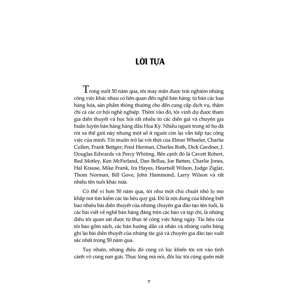 Công ty phát hành FIRST NEW Tác giả: Zig ZigLar Nhà Xuất Bản NXB Tổng Hợp Ngày xuất bản 12-2019 Kích thước 14 x 20.5 cm Loại bìa Bìa mềm Số Trang : 503 GIỚI THIỆU SẢN PHẨM : Nghệ Thuật Bán Hàng Bậc Cao Mục tiêu của một thương vụ là đảm bảo khách hàng nhận được giá trị tương xứng, nhưng nếu bạn mang đến cho khách hàng những giá trị còn cao hơn giá trị mà lẽ ra họ sẽ nhận được thì không những bạn đã có một thương vụ thành công mà bạn còn có thêm một khách hàng sẵn lòng giúp bạn có thêm nhiều khách hàng khác nữa. Triết lý chứa đựng trong cuốn sách Nghệ Thuật Bán Hàng Bậc Cao thật đơn giản: “bạn có thể có được những tất cả mọi thứ trong cuộc sống nếu bạn biết giúp người khác đạt được điều họ muốn”, thậm chí còn đúng đắn và cần thiết hơn trong cuộc sống hiện nay so với thời kỳ khi cuốn Nghệ Thuật Bán Hàng Bậc Cao được xuất bản lần đầu Trong cuốn sách kinh doanh này, bạn sẽ có cơ hội làm quen với nhiều người bán hàng sẵn sàng từ bỏ một thương vụ bởi họ biết rằng thương vụ đó không mang lại lợi ích tốt nhất cho khách hàng của mình. Khi đó, bán hàng trở nên giống như thi đấu thể thao, nhà vô địch quần vợt phải biết đánh bóng sao cho anh ta có thể đánh cú tiếp theo hiệu quả hơn, hay các tay gôn kỳ cựu cũng vậy. Nếu nhân viên bán hàng không quan tâm đến việc xây dựng và duy trì mối quan hệ tốt đẹp với khách hàng mà chỉ chăm chăm kiếm tiền từ túi người khác thì đảm bảo rằng họ sẽ nhanh chóng bị đào thải khỏi nghề này. Khi đọc cuốn sách Nghệ Thuật Bán Hàng Bậc Cao, các bạn cần linh động áp dụng từng nguyên tắc hay nghiều nguyên tắc cùng lúc để phù hợp với sản phẩm của bạn cũng như yêu cầu của khách hàng. Cuốn sách bao gồm rất nhiều ví dụ minh hoạ và những câu chuyện thực tế, được viết theo lối kể chuyện tự nhiên, do vậy bạn cần phải chủ động học hỏi – chứ không chỉ đơn giản chỉ đọc nó mà thôi. Một cuốn sổ tay nhỏ sẽ rất hữu ích trong việc giúp bạn ghi lại những ý tưởng quan trọng. Bạn hãy mạnh dạn đánh dấu vào sách những câu từ cần ghi nhớ và đừng lo lắng là nó sẽ bị cũ hay xấu đi Nên đọc quyển Nghệ Thuật Bán Hàng Bậc Cao này như thế nào? nội dung cuốn sách được viết theo lối kể chuyện, kết hợp với rất nhiều đoạn hội thoại và những mẫu chuyện vui. Hơn 700 câu hỏi và 250 chiến thuật kinh doanh, chiêu thức cũng như các cách thức kết thúc một thương vụ được gói gọn trong gần 100 câu chuyện, bài phân tích và nhiều câu chuyện khác nhau sẽ đem đến cho bạn cảm giác thú vị khi đọc. – “Nếu như chỉ gọi Zig Ziglar là một người bán hàng siêu hạng thì vẫn chưa đủ. Cuốn sách kinh tế này là tập hợp những hiểu biết về nghệ thuật bán hàng mà ông đã dày công sưu tầm. Vì vậy, cuốn sách này rất đáng để các bạn tìm đọc” – Richard M. DeVos, đồng sáng lập Anway, Chủ tịch và chủ sở hữu của NBA Orlando Magic. Trong lần tái bản này, cuốn sách Nghệ Thuật Bán Hàng Bậc Cao đã được đổi sang khổ lớn, bìa mềm với phương cách trang trọng hơn. Cuốn sách Nghệ Thuật Bán Hàng Bậc Cao sẽ tiếp tục là cuốn cẩm nang không thể thiếu với những ai đang hoạt động tranh lĩnh vực kinh doanh, bán hàng.