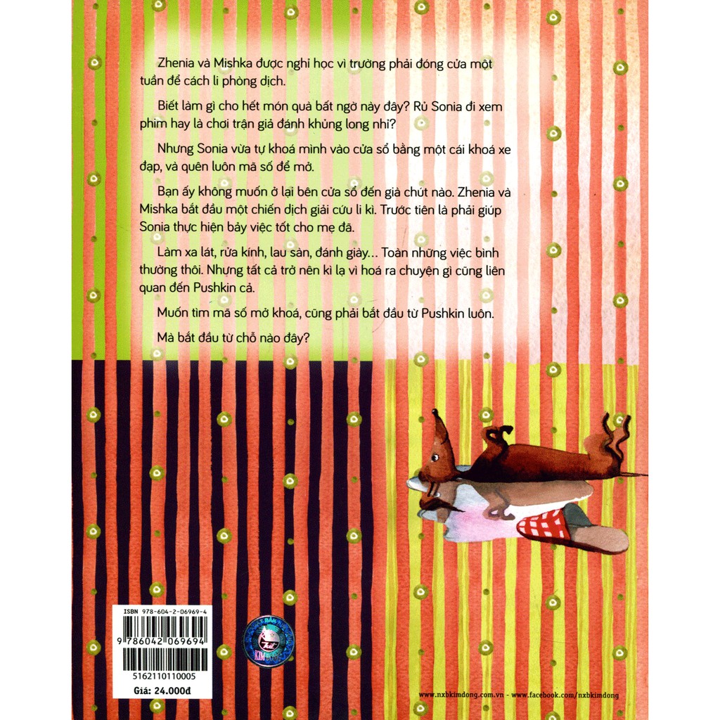 Zhenia và Mishka được nghỉ học vì trường phải đóng cửa một tuần để Cách li Phòng dịch. Biết làm gì cho hết món quà bất ngờ này đây? Rủ Sonia đi xem phim hay là chơi trận giả đánh khủng long nhỉ? Nhưng Sonia vừa tự khoá mình vào cửa sổ bằng một cái khoá xe đạp, và quên luôn mã số để mở. Bạn ấy không muốn ở lại bên cửa sổ đến già chút nào. Zhenia và Mishka bắt đầu một chiến dịch giải cứu li kì. Trước tiên là phải giúp Sonia thực hiện bảy việc tốt cho mẹ đã. Làm xa lát, rửa kính, lau sàn, đánh giày… Toàn những việc bình thường thôi. Nhưng tất cả trở nên kì lạ vì hoá ra chuyện gì cũng liên quan đến Pushkin cả. Muốn tìm mã số mở khoá, cũng phải bắt đầu từ Pushkin luôn. Mà bắt đầu từ chỗ nào đây???