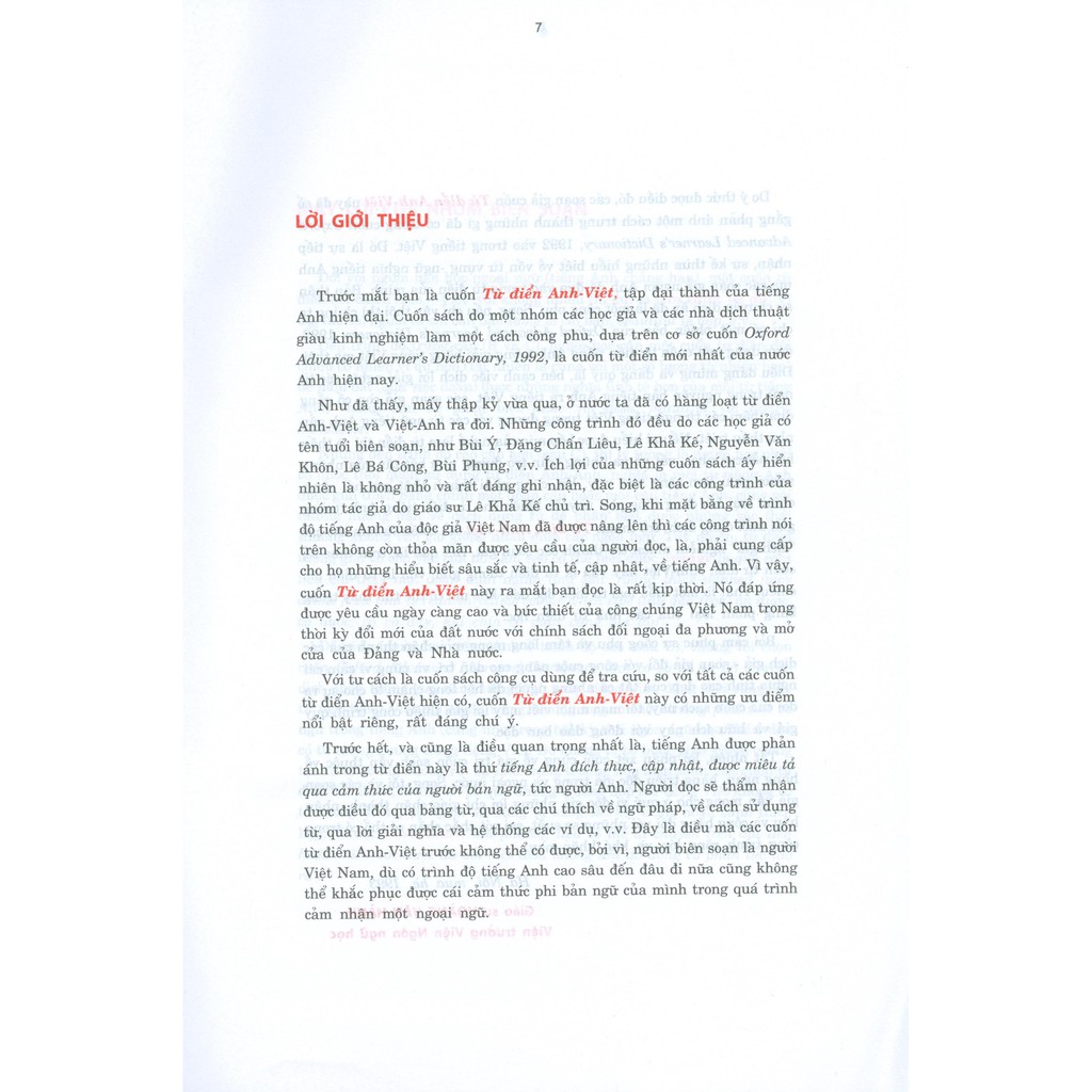 Sách – Từ Điển Anh Việt – English Vietnamese Dictionary Công ty phát hành Cty Văn Hóa Khang Việt Nhà xuất bản NXB Khoa Học Xã Hội Tác giả Viện Ngôn Ngữ Học Ngày xuất bản 2020 Số trang 2074 Kích thước 19 x 27 cm Loại bìa Bìa mềm Trước mắt bạn là cuốn Từ điển Anh-Việt, tập đại thành của tiếng Anh hiện đại. Cuốn sách do một nhóm các học giả và các nhà dịch thuật giàu kinh nghiệm làm một cách công phu, dựa trên cơ sở cuốn Oxford Advanced Learner’s Dictionary, 1992, là cuốn từ điển mới nhất của nước Anh hiện nay. Như đã thấy, mấy thập kỷ vừa qua, ở nước ta đã có hàng loạt từ điển Anh-Việt và Việt-Anh ra đời. Những công trình đó đều do các học giả có tên tuổi biên soạn, như Bùi Ý, Đặng Chấn Liêu, Lê Khả Kế, Nguyễn Văn Khôn, Lê Bá Công, Bùi Phụng, vv. Ích lợi của những cuốn sách ấy hiển nhiên là không nhỏ và rất đáng ghi nhận, đặc biệt là các công trình của nhóm tác giả do giáo sư Lê Khả Kế chủ trì. Song, khi mặt bằng về trình độ tiếng Anh của độc giả Việt Nam đã được nâng lên thì các công trình nói trên không còn thỏa mãn được yêu cầu của người đọc, là, phải cung cấp cho họ những hiểu biết sâu sắc và tinh tế, cập nhật, về tiếng Anh. Vì vậy, cuốn Từ điển Anh-Việt này ra mắt bạn đọc là rất kịp thời. Nó đáp ứng được yêu cầu ngày càng cao và bức thiết của công chúng Việt Nam trong thời kỳ đổi mới của đất nước với chính sách đối ngoại đa phương và mở cửa của Đảng và Nhà nước. Với tư cách là cuốn sách công cụ dùng để tra cứu, so với tất cả các cuốn từ điển Anh-Việt hiện có, cuốn Từ điển Anh-Việt này có những ưu điểm nổi bật riêng, rất đáng chú ý. Trước hết, và cũng là điều quan trọng nhất là, tiếng Anh được phản ánh trong từ điển này là thứ tiếng Anh đích thực, cập nhật, được miêu tả qua cảm thức của người bản ngữ, tức người Anh. Người đọc sẽ thẩm nhận được điều đó qua bảng từ, qua các chú thích về ngữ pháp, về cách sử dụng từ, qua lời giải nghĩa và hệ thống các ví dụ, vv. Đây là điều mà các cuốn từ điển Anh-Việt trước không thể có được, bởi vì, nguời biên soạn là người Việt Nam, dù có trình độ tiếng Anh cao sâu đến đâu đi nữa cũng không thể khắc phục được cái cảm thức phi bản ngữ của mình trong quá trình cảm nhận một ngoại ngữ. Do ý thức được điều đó, các soạn giả cuốn Từ điển Anh-Việt này đã cố gắng phản ánh một cách trung thành những gì đã có trong cuốn Oxford Advanced Learners Dictionary, 1992 vào trong tiếng Việt. Đó là sự tiếp nhận, sự kế thừa những hiểu biết về vốn từ vựng – ngữ nghĩa tiếng Anh mà các soạn giả người Anh đã đưa vào trong từ điển của mình. Bản thân sự chuyển dịch ấy đã là một công phu. Song, nếu chỉ vậy thôi thì chúng ta chỉ có một phiên bản của Oxford Advanced Learner’s Dictionary 1992, dưới dạng một cuốn từ điển tiếng Anh tường giải bằng tiếng Việt mà thôi. Điều đáng mừng và đáng quý là, bên cạnh việc dịch lời giải nghĩa các từ ngữ trong nguyên bản tiếng Anh ra tiếng Việt, các soạn giả còn cố gắng đưa thêm các từ ngữ tiếng Việt tương đương với các từ ngữ tiếng Anh gần như thấu triệt. Nếu ai hiểu được bếp núc của nghề làm từ điển thì sẽ thấu hết nỗi cực nhọc, vất vả và những trăn trở dường như bất tận của những người phải làm công việc này. Và, cũng phải thành thật mà nói rằng, chính loại lao động công phu này đã khiến cho từ điển tiếng Anh (tường giải dưới dạng dịch) trở thành Từ điển Anh-Việt đối chiếu và làm cho các “dịch giả” nghiễm nhiên trở thành các soạn giả. Kết quả là, trên thực tế, cuốn từ điển Anh-Việt này vừa là từ điển tường giải, vừa là từ điển đối chiếu. Thật là một kiểu loại từ điển độc đáo, khó mà có thể tìm thấy trong bảng phân loại của các nhà từ điển học. Bởi cảm phục sự công phu và tấm lòng mong mỏi chân thành của các dịch giả – soạn giả đối với công cuộc nâng cao dân trí, và cũng vì cảm cái nghĩa tình cao đẹp của tất cả những người đã hết lòng chăm lo cho sự ra đời của cuốn sách này, tôi mạo muội viết mấy lời giới thiệu công trình quý giá và hữu ích này với đông đảo bạn đọc. Tất nhiên, lời phán xét cuối cùng về giá trị cuốn sách vẫn thuộc về hàng ngàn, hàng triệu độc giả trong và ngoài nước. Song, tôi và các soạn giả vẫn mong chờ ở quý vị độc giả những lời chỉ giáo chân thành, nhân hậu và công bằng đối với những sơ suất, sai sót chắc chắn có thể có trong công trình rộng lớn và khó khăn này.