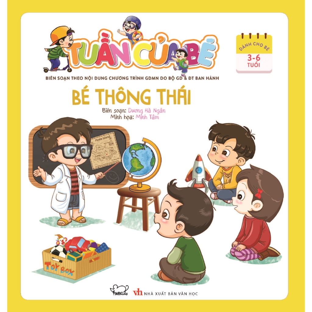 Công ty phát hành: Phuc Minh Books Nhà xuất bản: NXB Văn Học Tác giả: Dương Hà Ngân Loại bìa: Bìa Mềm Số trang: 24 Năm xuất bản: 2018 Từ 3-6 tuổi là giai đoạn quan trọng hình thành tính cách, tư duy của trẻ, nhưng cũng là giai đoạn mà cha mẹ lúng túng nhất trong việc nuôi dạy con cái. Công việc bận rộn, thời gian ít ỏi, câu hỏi đặt ra với các bậc phụ huynh là làm thế nào để theo dõi và hỗ trợ sự phát triển của con từng ngày. Thấu hiểu được nhu cầu đó, bộ sách Tuần của bé được xây dựng để trợ giúp cha mẹ trong hành trình cùng con khôn lớn. Mỗi cuốn Tuần của bé gồm 7 chuyên mục tương ứng với 7 ngày trong tuần, giúp bé gắn kết yêu thương, phát triển trí thông minh và hoàn thiện những kĩ năng quan trọng thông qua những hoạt động đa dạng. Dựa trên chủ đề giáo dục mầm non của Bộ Giáo dục và Đào tạo, chúng tôi tin chắc rằng Tuần của bé sẽ là một trợ thủ đắc lực cho các bậc phụ huynh có con trong lứa tuổi này. Với Tuần của bé, cha mẹ sẽ có chất liệu để chơi và học cùng con mỗi ngày. 7 chuyên mục tương ứng với 7 ngày, bao gồm những hoạt động đa dạng, trải đều trên các mặt kiến thức và kĩ năng cần thiết cho trẻ trong độ tuổi từ 3 đến 6. Thứ Hai – CHÀO TUẦN MỚI – Giới thiệu về các ngày đặc biệt, khí hậu và những hoạt động thường ngày của bé. Thứ Ba – THẾ GIỚI ĐÓ ĐÂY – Tìm hiểu về nét văn hóa độc đáo của các nước trên thế giới, khám phá đời sống động thực vật và các hiện tượng tự nhiên. Thứ Tư – CHUYỆN KỂ – Hòa mình vào thế giới của các câu chuyện cổ tích, ngụ ngôn, hay chuyện về các danh nhân với minh họa sinh động. Thứ Năm – TOWO ENGLISH – Giúp bé phát triển ngôn ngữ với hai từ tiếng Anh mỗi tuần, qua những câu thoại đơn giản và nhiều trò chơi thú vị, dễ ghi nhớ. Thứ Sáu – BÍ KÍP BỎ TÚI – Hướng dẫn bé những kĩ năng sống cần thiết, giúp bé phát triển toàn diện. Thứ Bảy – AI NHỚ GIỎI – Các vần thơ, ca dao, tục ngữ và chữ cái tiếng Việt dễ thuộc dễ nhớ góp phần bồi dưỡng tâm hồn trong sáng và kích thích khả năng ghi nhớ của bé. Chủ nhật – CUỐI TUẦN VUI – Bé được chơi và học cách làm đồ chơi, làm món ăn đơn giản… Bố mẹ và bé sẽ có ngày cuối tuần thật vui vẻ và hữu ích!