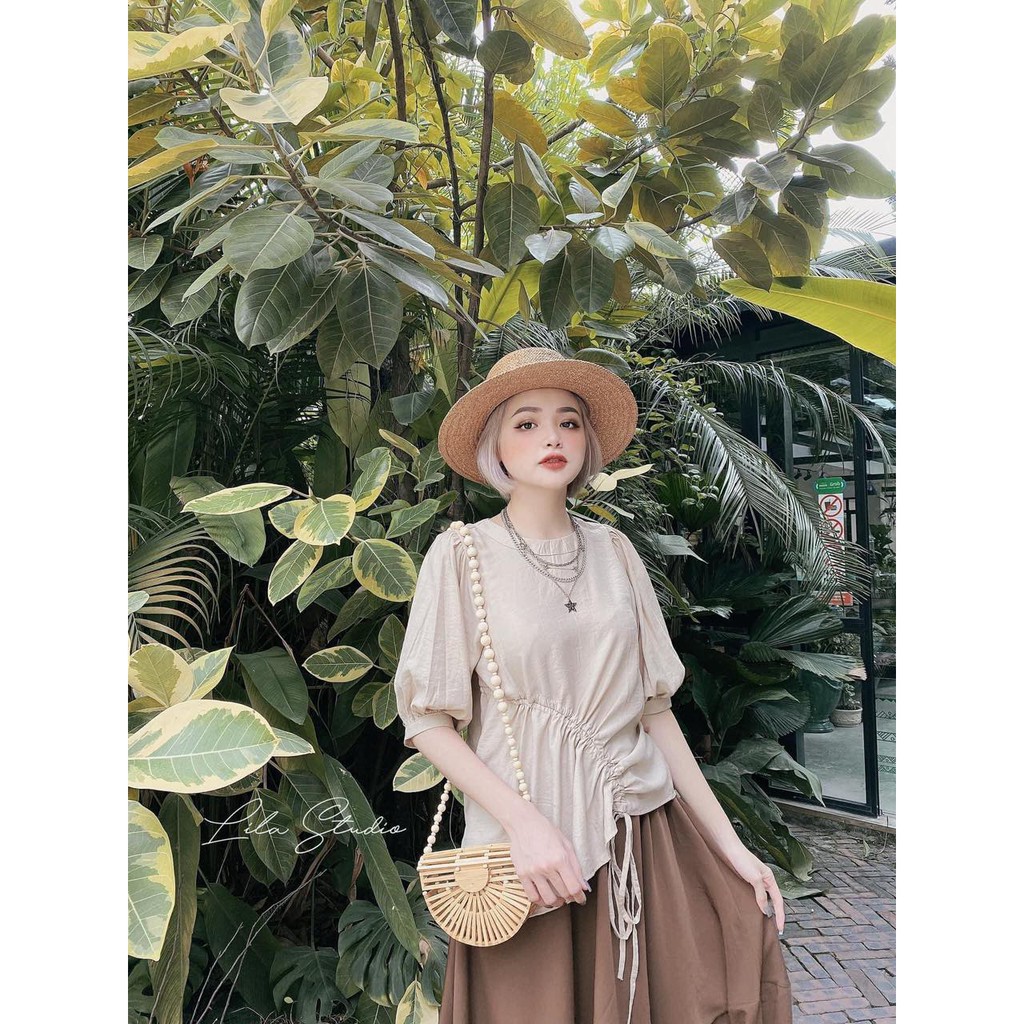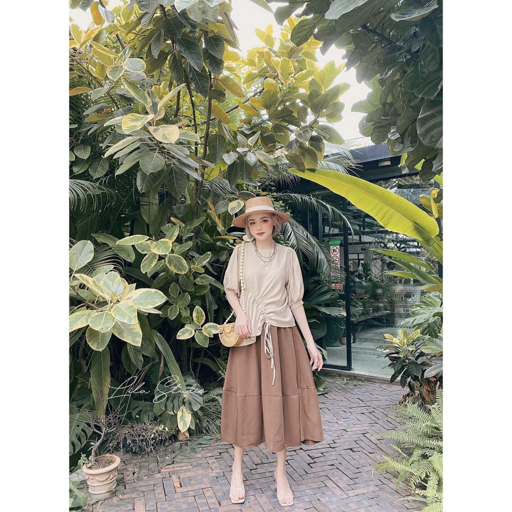 Bộ sản phẩm: Set Áo Kiểu Dúm Eo Chân Váy Nữ Bộ thun trơn áo tay bồng dây nơ kèm đầm xòe thô mềm vintage ulzzang.