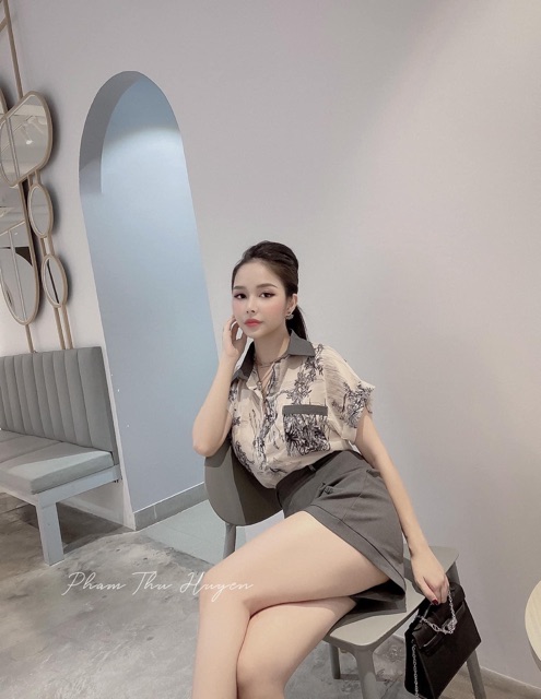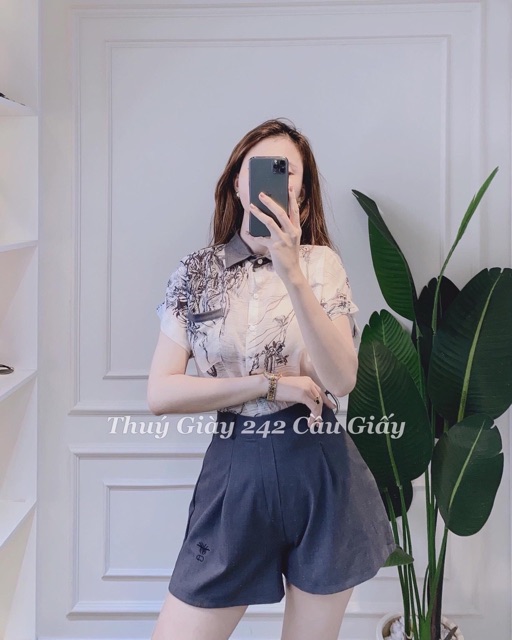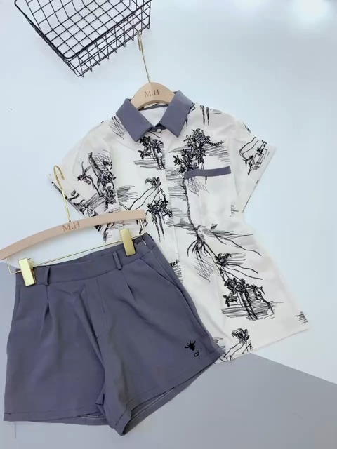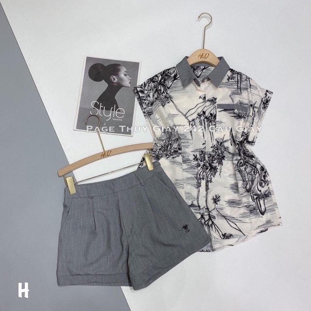 Bộ sản phẩm: SÉT ÁO SƠ MI HOA MIX QUẦN SOOC XÁM THÊU CD CHO NỮ.