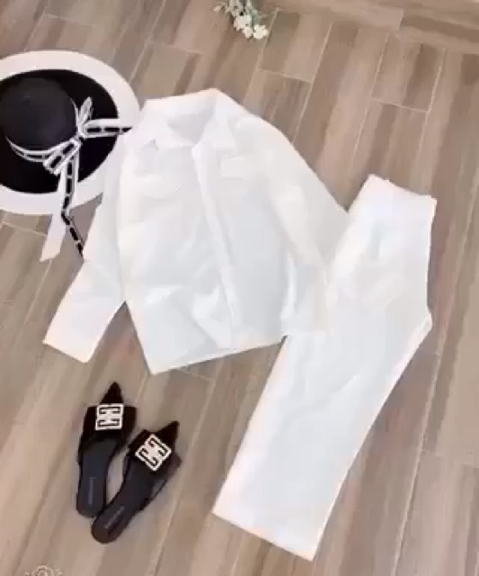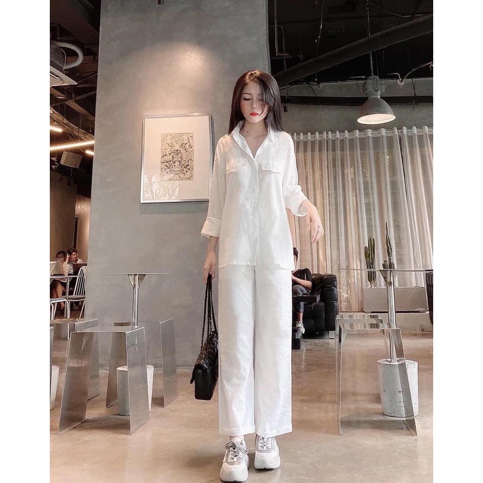 Bộ sản phẩm: Set đũi trắng dài tay sơ mi nữ Bộ quần suông ống rộng culottes kèm áo thun xước sơmi túi ngực Ulzzang.