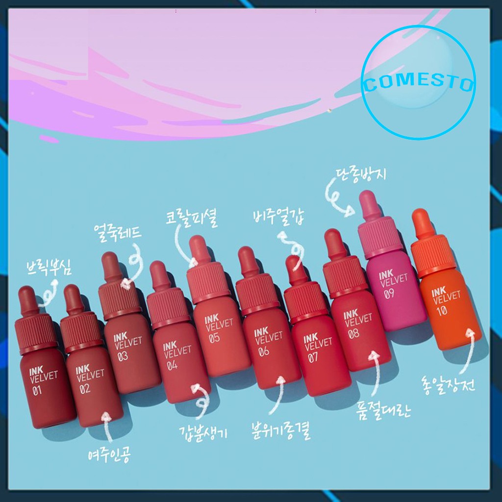 KÍNH CHÀO QUÝ KHÁCH HÀNG Comesto – CHUYÊN CUNG CẤP CÁC SẢN PHẨM CHĂM SÓC TÓC CHÍNH HÃNG TỪ NHỮNG THƯƠNG HIỆU HÀNG ĐẦU THẾ GIỚI Hotline (zalo) : 09022.65432 Địa chỉ : 64 Vũ Trọng Phụng – Thanh Xuân – Hà nội ✍ ———————————————————— Son kem lì Peripera Ink Velvet 01-23 mềm môi lâu trôi Xuất xứ: Hàn Quốc Hãng sản xuất: Peripera 1. Mô tả: – Cấu trúc son mịn, dịu và không làm nổi tế bào chết trên môi, sản phẩm có độ bền màu và lâu phai. Son Peripera INK THE VELVET TINT tạo độ mịn và thẩm thấu tuyệt vời. Đầu cọ và đuôi cọ trông thật đáng yêu! – Son Ink Peripera Ink The Velvet Tint chứa thành phần dưỡng môi từ collagen, acid hyaluronic, dầu jojoba và ô-liu giúp môi không bị khô khi sử dụng lâu dài. – Khi son khô lại thì trở nên dạng lì mịn màng và bám lâu trôi suốt thời gian dài lên đến hơn 6h! – Mùi hương ngọt ngào, không bị gắt khó chịu. #01 Good Brick #02 Celeb Deep Rose #03 Red Only #04 Vitality Coral #05 Coralficial #06 Purdy Red #07 Girlish Red #08 Sellout Red #09 Sparkling Pink #10 Better Orange – Follow Shop: Dành cho khách THEO DÕI SHOP, chỉ 1 lần bấm giá sẽ được ưu đãi nhiều lần. Trường hợp này nếu bạn ko bấm Follow Shop, sản phẩm sẽ ko được gửi đi (Shop sẽ bù tiền vào trong gói hàng ạ). – Ko Follow Shop: Dành cho khách KO THEO DÕI SHOP. ⚠️ CAM KẾT: CÓ THỂ BẠN MUA ĐẮT HƠN 5 NGÀN, HOẶC RẺ HƠN 5 NGÀN ⚠️ NHƯNG TUYỆT TỐI KHÔNG BAO GIỜ CÓ HÀNG FAKE TẠI COMESTO