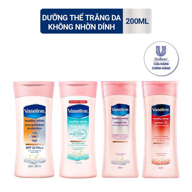 Sữa dưỡng thể trắng da Vaseline 200ml Khởi đầu bằng sự diệu kỳ của Sáp dưỡng ẩm Vaseline (Vaseline Petrolium Jelly) và được ưu việt hóa dần trong 140 năm, sữa dưỡng thể Vaseline mới được bổ sung các giọt Vaseline Jelly siêu nhỏ, giúp phục hồi hư tổn từ sâu bên trong**, dưỡng trắng da dài lâu. Với SPF 24 và PA +++ tạo nên lớp chắn hoàn hảo dưới ánh nắng gay gắt. 1/ SỮA DƯỠNG THỂ SÁNG DA TỨC THÌ VASELINE HEALTHY WHITE INSTANT FAIR – Vi chất phản quang cho làn da sáng tức thì gấp 4 lần* – Sáp dưỡng ẩm Vaseline Jelly giúp phục hồi hư tổn từ sâu bên trong**. – Màng chống nắng 3 tác động bảo vệ khỏi tác hại của UVA & UVB Sản phẩm được kiểm nghiệm & chứng nhận an toàn cho da. *Dựa theo kết quả thử nghiệm lâm sàng thực hiện tại Hoa Kỳ 2013 khi sử dụng thường xuyên. Kết quả này có thể thay đổi tùy vào màu da của mỗi người. **ở tầng biểu bì. 2/ SỮA DƯỠNG THỂ TRẮNG DA 10 LỢI ÍCH VASELINE HEALTHY WHITE PERFECT 10 – AHA & Pro-Retinol: giúp loại bỏ tế bào chết, kích thích sản xuất collagen và giảm thiểu vết nhăn. – Sáp dưỡng ẩm Vaseline Jelly giúp phục hồi hư tổn từ sâu bên trong*. – 1 giải pháp toàn diện cho 10 lợi ích: 1. Trắng lên trông thấy 2. Làm đều màu da 3. Chống nắng (UVA & UVB) 4. Giảm vết thâm 5. Rạng rỡ, trông đầy sức sống 6. Mềm mịn & săn chắc 7. Làm mờ nếp nhăn trông thấy 8. Tái tạo da 9. Dưỡng ẩm da hiệu quả 10. Nuôi dưỡng da từ sâu bên trong* *ở tầng biểu bì *Nơi sản xuất: Việt Nam 3/ SỮA DƯỠNG THỂ TRẮNG, BẢO VỆ DA TRƯỚC NẮNG VÀ Ô NHIỄM MÔI TRƯỜNG VASELINE HEALTHY WHITE SUN + POLLUTION PROTECTION SPF24 PA++ – BẠN CÓ BIẾT Ô NHIỄM MÔI TRƯỜNG LÀ KẺ THÙ KHIẾN LÀN DA ĐEN SẠM? – Ở các thành phố lớn, da chúng ta bị tổn thương và sạm đen bởi ô nhiễm khói bụi nhiều gấp 20 lần so với nông thôn. – Với PPF – công thức vượt trội bảo vệ da khỏi tác hại của ô nhiễm môi trường. – SPF 24 và PA +++ tạo nên lớp chắn hoàn hảo dưới ánh nắng gay gắt. – Tinh chất Petroleum Jelly, thấm sâu vào tầng biểu bì, phục hồi những vùng da hư tổn. – Vitamin B3 và vitamin E, giúp dưỡng trắng da từ sâu bên trong*, phục hồi những hư tổn và dưỡng da trắng hơn. * Ở tầng biểu bì 4/ SỮA DƯỠNG THỂ DỊU MÁT VÀ TRẮNG DA VASELINE FRESH & FAIR 200ML Với kết cấu mỏng nhẹ cùng tinh chất bạc hà, Gel dưỡng thể Dịu mát Trắng da thấm nhanh tức thì**, giúp dưỡng trắng mà không gây nhờn rít, mang đến cảm giác dịu mát suốt ngày dài. Kết hợp cùng tinh chất VASELINE JELLYTM, VASELINE phục hồi những vùng da hư tổn từ sâu bên trong***, cùng gấp 10 hàm lượng Vitamin B3 (Niacinamide)* giúp da trắng dần lên trông thấy sau 2 tuần. – Chứa gấp 10 lần hàm lượng Vitamin B3 (Niacinamide)* và hoạt chất chống nắng – Thấm nhanh tức thì, không gây nhờn rít – Tinh chất bạc hà cho da dịu mát suốt ngày dài * Chứa hàm lượng vitamin B3 gấp 10 lần so với sản phẩm Vaseline Healthy White Sun+Pollution Protection **Dựa trên kết quả kiểm nghiệm trên người tiêu dùng tại Thái Lan – Tháng 11/2017 *** Tại tầng biểu bì Hướng dẫn sử dụng: Thoa đều sữa dưỡng thể lên cánh tay, chân và toàn thân. Để có được kết quả tốt nhất, nên dùng thường xuyên mỗi ngày 2 lần sáng và tối. Hạn sử dụng: 24 tháng kể từ ngày sản xuất Nơi sản xuất: Thái Lan Xuất xứ: Indonesia **SỮA DƯỠNG THỂ TRẮNG DA 10 LỢI ÍCH VASELINE HEALTHY WHITE PERFECT 10: Xuất xứ: Việt Nam. Hạn sử dụng: 30 tháng kể từ ngày sản xuất. Bao bì có thể thay đổi tùy đợt nhập hàng…. #suaduongthe #duongda #vaseline #duongamvaseline