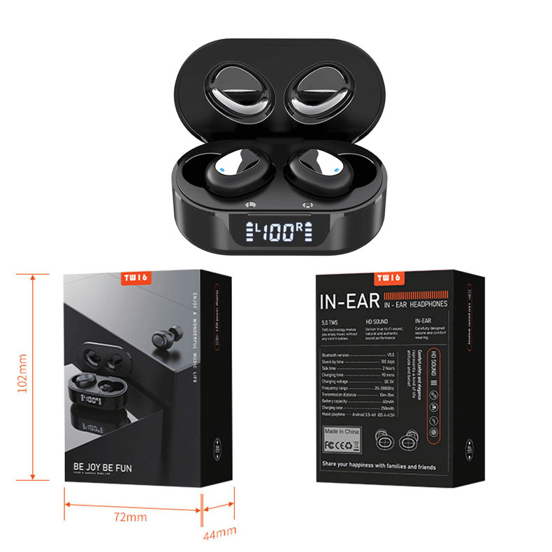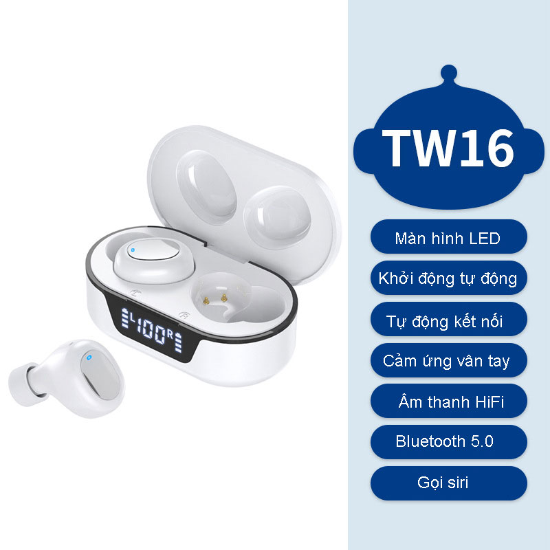 Video chi tiết sản phẩm : Các thông số chính: Mô hình sản phẩm: Tai nghe Bluetooth TW16 Giải pháp Bluetooth: Bluetooth V5.0, cuộc gọi hai tai độ nét cao, chuyển mạch master-slave Loa sản phẩm: chip loa màng composite chất lượng cao : chip âm thanh nổi thực sự Thời gian chờ: 480 giờ Thời gian làm việc: 3-4 giờ, ngăn sạc có thể sạc tai nghe 3-4 lần. Thời gian sạc: khoảng 1 giờ Khoảng cách giao tiếp : 15-18 mét không có rào cản Dung lượng pin tai nghe: coban nguyên chất 40 mA Dung lượng pin hộp sạc: coban nguyên chất 250 mA (có bo mạch bảo vệ IC) Thông tin đóng gói: Trọng lượng kim loại trần: 39,5g Trọng lượng gói: 108g Phụ kiện sản phẩm: Bộ 3 nắp chụp tai + Cáp sạc Type-C + Sách hướng dẫn tiếng Trung và tiếng Anh Kích thước hộp màu: 10.2 * 7.2 * 4.4cm Màn hình LED hiển thị kỹ thuật số + chất lượng âm trầm lớn + cảm ứng thông minh + khởi động tự động lấy ra + ghép nối tự động