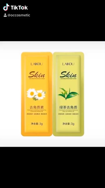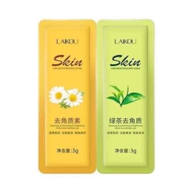 LAIKOU MẪU MỚI Tẩy tế bào chết body Sữa bơ + Dâu tây Ttbc mặt Hoa cúc + Trà xanh Mặt nạ bùn Trà xanh + Hoa anh đào Đây là các gói dạng sample của hãng , 3gam/1gói . Loại này em bán theo set , 1 set có 2 gói nhỏ như hình