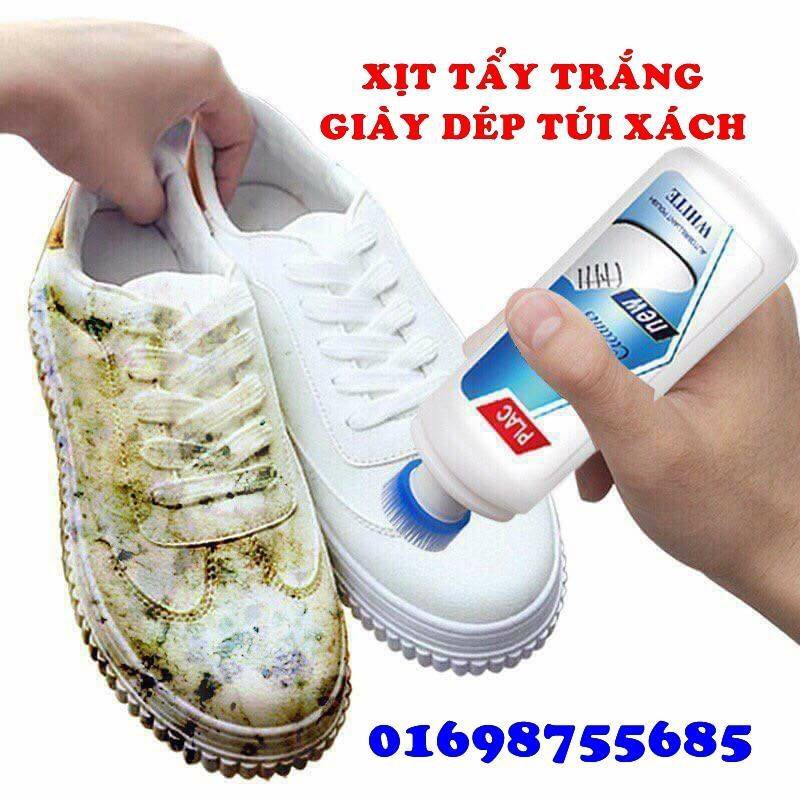 Chai tẩy trắng giày dép túi xách Giá chỉ 20k 1 lọ Mang đến cho bạn giải pháp đánh sạch vết bẩn, làm trắng lại đai giày hay chiếc túi xách sang trọng của bạn. Thông tin sản phẩm chai xịt tẩy trắng giày dép túi xách Plac : – Kích thước chai: 13x5x4cm; – Thành phần: nước tinh khiết, Cilicate Flour, Glycerin… giúp tẩy trắng mà vẫn giữ an toàn cho da giày, da túi xách; – Hàng tiện dụng, dễ mang đi xa. – Sản phẩm là phụ kiện cần có cho mỗi gia đình hay dân văn phòng, dân thể thao. Hướng dẫn sử dụng chai xịt tẩy trắng Plac : – Đối với những đôi giày vải: + Bước 1: Dùng một chiếc bản chải giày sạch và khô chải sạch vết bẩn trên giày. + Bước 2: Dùng bản chải mềm thấm nước tẩy rửa rồi chà sát lên vết bẩn. + Bước 3: Phun chất bảo vệ vải lên giày để bảo vệ và không làm hư vải sau khi chà sát và sử dụng chất tẩy rửa. – Đối với giày cao su: + Bước 1: Dùng một miếng vải ẩm quấn quanh đầu ngón tay rồi lau đi bụi bẩn. + Bước 2: Cho xà phòng lên miếng vải và lau sạch lại bề mặt. + Bước 3: Dùng bàn chải cứng chà giày thật kỹ, rồi rửa sạch dưới vòi nước. – Đối với giày da màu trắng: + Bước 1: Dùng vải mềm lau sạch bề mặt bị bám bẩn. + Bước 2: Tháo dây giày và tiếp tục vệ sinh. + Bước 3: Chuẩn bị dung dịch để rửa bằng cách pha nước ấm với xà phòng hay nước rửa chén hoặc với bất kì một loại xà phòng rửa tay thông thường khác. + Bước 4: Dùng bàn chải nhẹ nhàng chải trên bề mặt và bên trong đôi giày, lưu ý là phải chà thật nhẹ nhàng vì da rất dễ bị sướt. + Bước 5: Dùng nước ấm rửa sạch. + Bước 6: Nhồi khăn giày vào trong đôi giày để hút nước rồi đem đi sấy. Lưu ý, thay khăn liên tục nếu chúng bị ướt. + Bước 7: Treo đôi giày để nó khô hẳn
