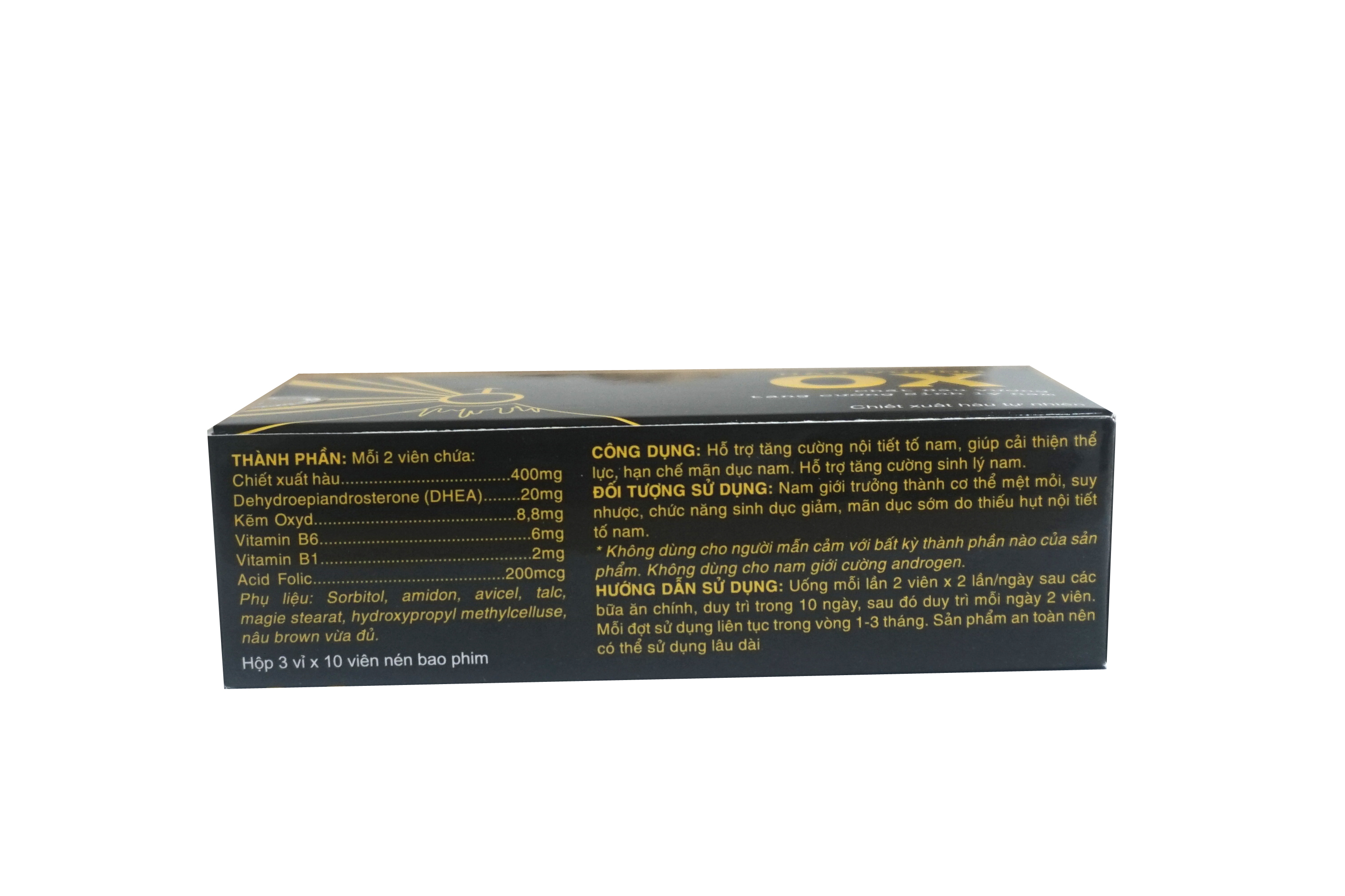 Hỗ trợ tăng cường sinh lý nam Chiết xuất hàu biển giúp tăng số lượng và chất lượng tinh trùng ở những người hiếm muộn, muốn sinh con Giảm mãn dục nam Hàu biển từ lâu đã được ví là ” thực phẩm của tình yêu” có tác dụng tích cực với khả năng sinh lý của nam giới. Sản phẩm HÀU VƯƠNG OX với chiết xuất từ 100% Hàu biển NHẬP KHẨU giúp bổ sung kẽm và những chất cần thiết giúp kích thích sản xuất Testosterone và tăng ham muốn ở nam giới, tăng chất lượng TINH TRÙNG đặc biệt ở những người hiếm muộn muốn có con, duy trì thời gian bền bỉ. Giảm tình trạng xuất tinh sớm, duy trì phong độ trong suốt thời gian dài không giống các sản phẩm chữa cháy tạm thời khác. Công dụng: Hỗ trợ tăng cường nội tiết tố nam, giúp cải thiện thể lực, hạn chế mãn dục nam Hỗ trợ tăng cường sinh lý nam Vậy những đối tượng nào nên sử dụng HÀU VƯƠNG OX? Người tinh trùng yếu, người hiếm muộn đang muốn có con Người muốn cải thiện đời sống tình dục, cải thiện “cậu nhỏ” Người muốn tăng cường sức khỏe, tăng khả năng sinh lý Thành phần: Mỗi viên chứa: Chiết xuất hàu…………………………400mg Dehydroepiandrosterone (DHEA)…..20mg Kẽm Oxyd………………………………8.8mg Vitamin B6……………………………..6mg Vitamin B1……………………………..2mg Hướng dẫn sử dụng: Uống mỗi lần 2 viên x 2 lần/ngày sau các bữa ăn chính, duy trì trong 10 ngày, sau đó duy trì mỗi ngày 2 viên. Mỗi đợt sử dụng liên tục trong vòng 1-3 tháng Thông tin thương hiệu: Sản phẩm được sản xuất và phân phối bởi Công ty Cổ phần Dược phẩm Trường Thọ Công ty Cổ phần Dược phẩm Trường Thọ tiền thân là Công ty TNHH Dược phẩm Trường Thọ được thành lập từ tháng 3/2000. Với gần 20 năm hình thành và phát triển, công ty đã không ngừng nỗ lực để mang tới cho khách hàng những sản phẩm có chất lượng cao và đạt các tiêu chuẩn quốc tế. Công ty hiện có mạng lưới bán hàng tại hầu hết các tỉnh thành trong cả nước với hệ thống kinh doanh, phân phối đạt tiêu chuẩn GDP, GPP do Cục quản lý Dược Việt Nam chứng nhận.