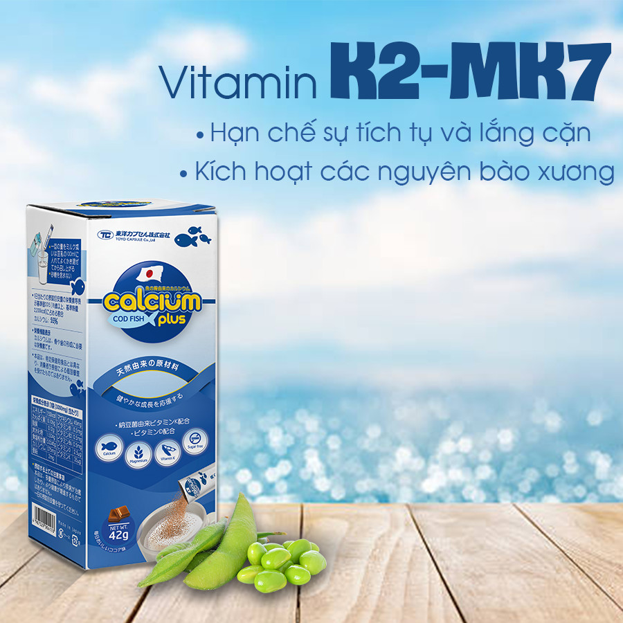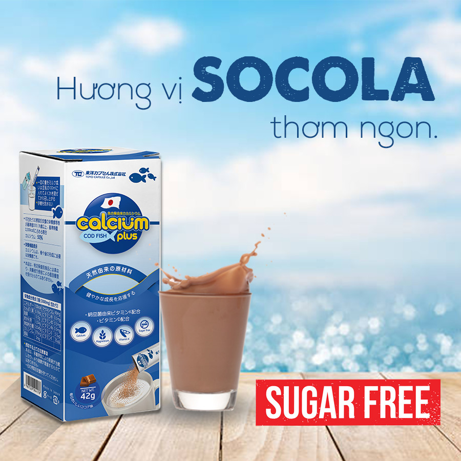 Nguyên liệu có nguồn gốc tự nhiên Hỗ trợ tăng trưởng lành mạnh Sugar free, vị chocolate. THÀNH PHẦN TRONG 1 gói 3g Calcium (từ xương cá tuyết) 375 mg, Kẽm (từ men bia) 2 mg, Magiê (từ gạo) 45 mg, Vitamin K (từ đậu nành lên men) 35 μg, Vitamin D 2,5 μg, Vitamin B1 0,5 mg, Vitamin B2 0,5 mg, Vitamin B6 0,5 mg, bột ca cao, Dextrin, Stevia, Sucralose. Chúng tôi sử dụng nguyên liệu có nguồn gốc tự nhiên, sự khác biệt về màu sắc có thể xảy ra, nhưng không có vấn đề về chất lượng CÔNG DỤNG: Hỗ trợ bổ sung canxi và các vitamin cần thiết cho cơ thể. Hỗ trợ giúp xương, răng phát triển và rắn chắc, giúp làm giảm nguy cơ loãng xương. ĐỐI TƯỢNG SỬ DỤNG: – Trẻ em bị còi xương, chậm lớn, chậm mọc răng do thiếu hụt canxi. – Trẻ đang trong tuổi trưởng thành, phụ nữ mang thai và đang cho con bú cần tăng bổ sung canxi do chế độ ăn thiếu hụt. – Người cao tuổi bị loãng xương hoặc có nguy cơ loãng xương. CÁCH DÙNG: · Trẻ em dưới 8 tuổi: 1 gói/ngày, hỏi ý kiến thầy thuốc trước khi sử dụng · Trẻ đang phát triển chiều cao, thể lực: 2 gói/ngày · Phụ nữ mang thai và cho con bú: 2 gói/ngày · Người cao tuổi: 2 gói/ngày · Các đối tượng khác cần bổ sung canxi và vitamin hỏi ý kiến thầy thuốc trước khi sử dụng. – Cho 1 gói 3g vào 100ml sữa hoặc sữa đậu nành hoặc nước, khuấy đều rồi thưởng thức. Uống trong hoặc sau bữa ăn. – Lưu ý: Thực phẩm này không phải là thuốc, không có tác dụng thay thế thuốc chữa bệnh BẢO QUẢN: Nơi khô ráo, tránh ánh nắng trực tiếp CẢNH BÁO SỨC KHỎE: Không sử dụng nếu có tác dụng không mong muốn hoặc mẫn cảm với bất kì thành phần nào của sản phẩm. TRỌNG LƯỢNG TỊNH: 42g (hộp 14 gói 3g) HẠN SỬ DỤNG: 3 năm kể từ ngày sản xuất. Sản xuất tại : Nhà sản xuất Toyo Capsule Co., Ltd. Nhà máy Shibakawa. Địa chỉ: Quận Shizuoka Fujinomiya shimotsuno 175-1, Nhật Bản. Số ĐKSP: 8460/2018/ĐKSP ————————————————————————————————————————————————————————– Sản phẩm được sản xuất tại: Công ty Toyo Capsule Nhật Bản Thực phẩm này không phải là thuốc và không có tác dụng thay thế thuốc chữa bệnh.