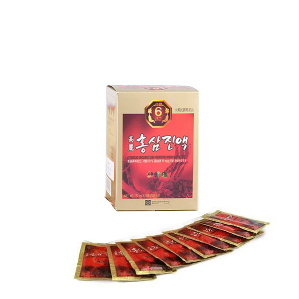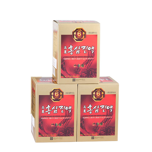 * Sản phẩm này không phải là thuốc, không có tác dụng thay thế thuốc chữa bệnh • Chứa hồng sâm Hàn Quốc 6 năm tuổi, Vitamin nhóm B • Bồi bổ sức khỏe, tăng cường sức đề kháng, duy trì tinh thần minh mẫn, tỉnh táo • Hộp 30 gói x 70ml Quy cách đóng gói Hộp 30 gói Xuất xứ Hàn Quốc Dung tích 2100ml Công dụng Bồi bổ sức khỏe, nâng cao sức đề kháng, giúp nâng cao tình thần, trí nhớ, minh mẫn Thành phần Hồng sâm 6 năm tuổi 0,3%, Taurine, VitaminB1, Vitamin B6, Vitamin B2, Vitamin PP, chiết xuất thảo dược tổng hợp Mô tả sản phẩm Hồng sâm Hàn Quốc luôn được coi là “Kho báu từ phương Đông” và luôn là sản phẩm quý dùng để bồi bổ và tăng cường sức khỏe cho mọi người. Với các dưỡng chất tuyệt vời có trong hồng sâm, các sản phẩm được chiết xuất từ hồng sâm khi sử dụng đều đặn với liều lượng hợp lý sẽ giúp tăng cường sức khỏe, nâng cao sức đề kháng, giảm căng thăng, mệt mỏi, giúp tinh thần tỉnh táo, minh mẫn, hệ thống tuần hoàn được nâng cao, kích thích tiêu hóa. Bên cạnh đó, hồng sâm còn có tác dụng cân bằng nội tiết tố ở cả nam và nữ, gia tăng chất lượng cuộc sống. Từ đó, cơ thể sẽ giảm thiểu được các bệnh như huyết áp, mỡ máu, tai biến, tiểu đường, rối loạn nội tiết. Hồng sâm Hàn Quốc luôn được coi là “Kho báu từ phương Đông” Sản phẩm Nước hồng sâm Hàn Quốc 6 năm tuổi Chong Kun Dang 6 Years Korean Red Ginseng Extract Liquid chứa hồng sâm cùng các Vitamin nhóm B thiết yếu sẽ giúp bồi bổ sức khỏe, tăng khả năng làm việc, giúp đầu óc minh mẫn, sảng khoái, nâng cao hiệu quả làm việc và tăng khả năng trí nhớ. Sản phẩm thích hợp dùng cho người cần bồi dưỡng sức khỏe, trí nhớ kém, cơ thể mệt mỏi, mất tập trung, người mới ốm dậy. Nước hồng sâm Hàn Quốc 6 năm tuổi Chong Kun Dang 6 Years Korean Red Ginseng Extract Liquid Sản phẩm này không phải là thuốc, không có tác dụng thay thế thuốc chữa bệnh. Hướng dẫn sử dụng và bảo quản Dùng 1 gói mỗi ngày Bảo quản nơi khô mát, tránh ánh nắng trực tiếp Thông tin thương hiệu Chong Kun Dang là thương hiệu thuộc Công ty Chong Kun Dang Corp, được thành lập từ năm 1950 trên nền tảng để trở thành một công ty dược phẩm tiên phong tại Hàn Quốc. Chong Kun Dang chuyên cung cấp các sản phẩm trong việc cải thiện và nâng cao sức khỏe để mang đến sự hài lòng cho người tiêu dùng trên khắp thế giới. Với hệ thống máy móc, công nghệ hiện đại, tiên tiến, cùng nguồn gốc thành phần thiên nhiên chọn lọc, Chong Kun Dang luôn nỗ lực không ngừng để mang đến các sản phẩm chất lượng cao, an toàn để chăm sóc sức khỏe khách hàng.