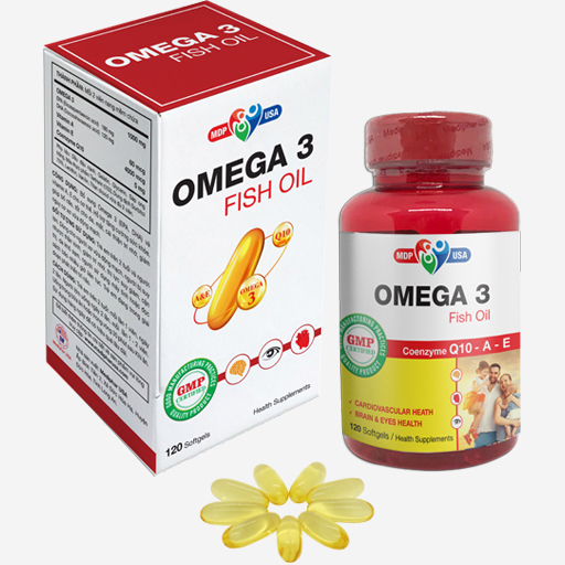 Bổ sung Omega 3 (EPA, DHA) và vitamin A, E cho cơ thể. Hỗ trợ tăng cường sức khỏe, giúp bổ não, tốt cho da, mắt,. Cải thiện trí nhớ, giảm nguy cơ xơ vữa động mạch. Omega 3 Fish Oil – Bổ não, tốt cho da và mắt Omega-3 là một nhóm các axit béo chưa no có nhiều nối đôi, và nối đôi cần nhất ở vị trí Carbon thứ 3, mà cơ thể chúng ta không tự tổng hợp được, phải bổ sung hoàn toàn từ thực phẩm. Các nhà nghiên cứu đã chỉ ra rằng axit béo Omega-3 có nhiều trong các loại cá ở vùng biển lạnh và sâu như cá Ngừ, cá Hồi, cá Thu. Chất lỏng lấy từ các loại cá này ở nước ta quen gọi là dầu gan cá hay dầu cá. Tuy nhiên dầu gan cá ngoài Omega-3 còn chứ nhiều Vitamin A, không được khuyến khích bổ sung cho bà bầu vì nguy cơ dư thừa Vitamin A có thể gây dị tật bẩm sinh ở thai nhi. THÀNH PHẦN: Mỗi 2 viên nang mềm chứa OMEGA mg EPA (Eicosapentaenoic acid) mg DHA (Docosahexaenoic acid) 120 mg Vitamin A mcg Vitamin E mcg Coenzyme Q mg CÔNG DỤNG: Bổ sung Omega 3 (EPA, DHA) và vitamin A, E cho cơ thể. Hỗ trợ tăng cường sức khỏe, giúp bổ não, tốt cho da, mắt, cải thiện trí nhớ, giảm nguy cơ xơ vữa động mạch. ĐỐI TƯỢNG SỬ DỤNG: Trẻ em trên 2 tuổi và người lớn trong trường hợp: Dùng cho người xơ vữa động mạch, người bị suy nhược thần kinh, giảm trí nhớ, thị lực suy giảm, cận thị, da khô sạm, người sử dụng máy tính hoặc đọc sách báo nhiều giờ liên tục. Trẻ em đang trong giai đoạn phát triển trí não.HƯỚNG DẪN SỬ DỤNG: Trẻ em trên 2 tuổi: mỗi lần 1 viên, ngày 2 lần. Người lớn uống ngày 2 lần, mỗi lần 1 – 2 viên. Uống trong bữa ăn hoặc trong vòng 30 phút sau khi ăn. Sử dụng hàng ngày để có hiệu quả lâu dài.