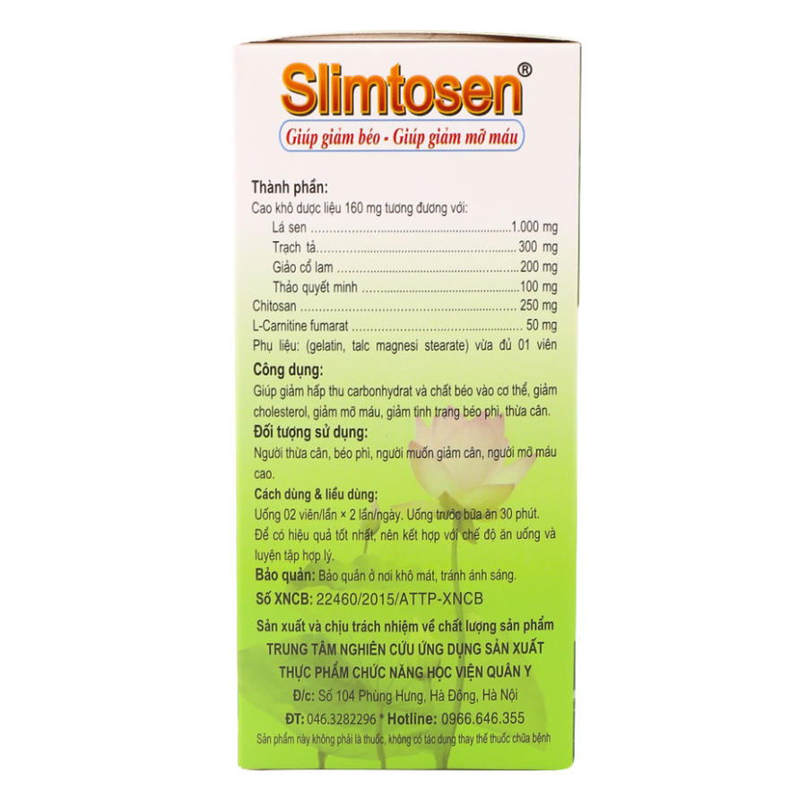 Bộ sản phẩm Thực Phẩm Chức Năng Thuốc hỗ trợ Giảm Cân Học Viện Quân Y Slimtosen Extra (100 Viên) , Thương hiệu Học Viện Quân Y Xuất xứ thương hiệu Việt Nam Xuất xứ Việt Nam Hạn sử dụng Xem trên bao bì sản phẩm Lưu ý Sản phẩm này là không phải là thuốc, không có tác dụng thay thế thuốc chữa bệnh Mức độ hiệu quả tùy thuộc thể trạng thể chất mỗi người SKU 3315180822982.