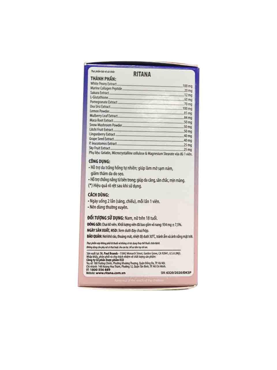 Bộ sản phẩm Thực Phẩm Chức Năng Viên Uống Trắng Da RITANA Làm Mờ Sạm Nám, Trẻ Hóa Da (Chai 60 Viên) Thương hiệu: RITANA.
