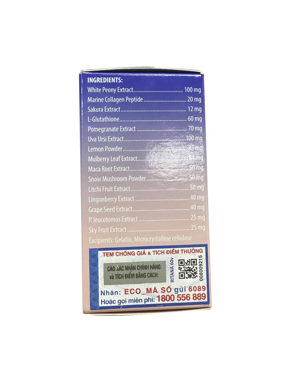 Trắng da, da bật tông trắng hồng, trắng khoẻ tự nhiên. Mờ sạm nám, vết thâm mụn; ngăn ngừa hình thành vết nám mới. Làm chậm lão hóa da, giúp da căng sáng, săn chắc, mịn màng, giảm nếp nhăn. Chống nắng từ bên trong, tăng cường phục hồi tổn thương da do nắng (nhả nắng). Bảo vệ và tăng cường sức khỏe cho da THỰC PHẨM CHỨC NĂNG VIÊN UỐNG TRẮNG DA RITANA LÀM MỜ SẠM NÁM, TRẺ HÓA DA (CHAI 60 VIÊN) CÔNG DỤNG Công thức độc đáo của viên uống trắng da RITANA chính là sự kết hợp những tính năng làm đẹp ưu việt từ các tinh chất thiên nhiên quý tác động đến tế bào giúp: Trắng da, da bật tông trắng hồng, trắng khoẻ tự nhiên. Mờ sạm nám, vết thâm mụn; ngăn ngừa hình thành vết nám mới. Làm chậm lão hóa da, giúp da căng sáng, săn chắc, mịn màng, giảm nếp nhăn. Chống nắng từ bên trong, tăng cường phục hồi tổn thương da do nắng (nhả nắng). Bảo vệ và tăng cường sức khỏe cho da THÀNH PHẦN CÁCH DÙNG Ngày uống 2 lần (sáng, chiều), mỗi lần 1 viên. Nên dùng thường xuyên. ĐỐI TƯỢNG SỬ DỤNG Nam, nữ trên 18 tuổi ƯU ĐIỂM VƯỢT TRỘI CỦA VIÊN UỐNG TRẮNG DA RITANA Hiệu quả vượt trội: da toàn thân trắng hồng, làm mờ sạm nám, làm chậm lão hóa, da căng mịn, săn chắc, chống nắng từ bên trong… An toàn: thành phần từ thiên nhiên, tinh chiết theo công nghệ tiên tiến, giúp dễ hấp thu, đạt hiệu quả tốt và an toàn khi sử dụng. Uy tín đảm bảo: các thành phần đã được kiểm chứng khoa học, ứng dụng công nghệ sinh học phân tử, được nhiều chuyên gia khuyên dùng, là bí quyết làm đẹp của các hoa hậu. Tiện dụng: Liều dùng tiện lợi (chỉ cần uống 2 viên/ngày), sản phẩm có mặt tại các nhà thuốc trên toàn quốc. Nam nữ đều dùng được. Sản xuất tại Mỹ QUY CÁCH ĐÓNG GÓI VÀ BẢO QUẢN Đóng gói: 60 viên Bảo quản: Nơi khô ráo, thoáng mát, nhiệt độ dưới 30 độ C, tránh ẩm và ánh nắng mặt trời, để xa tầm tay trẻ em.