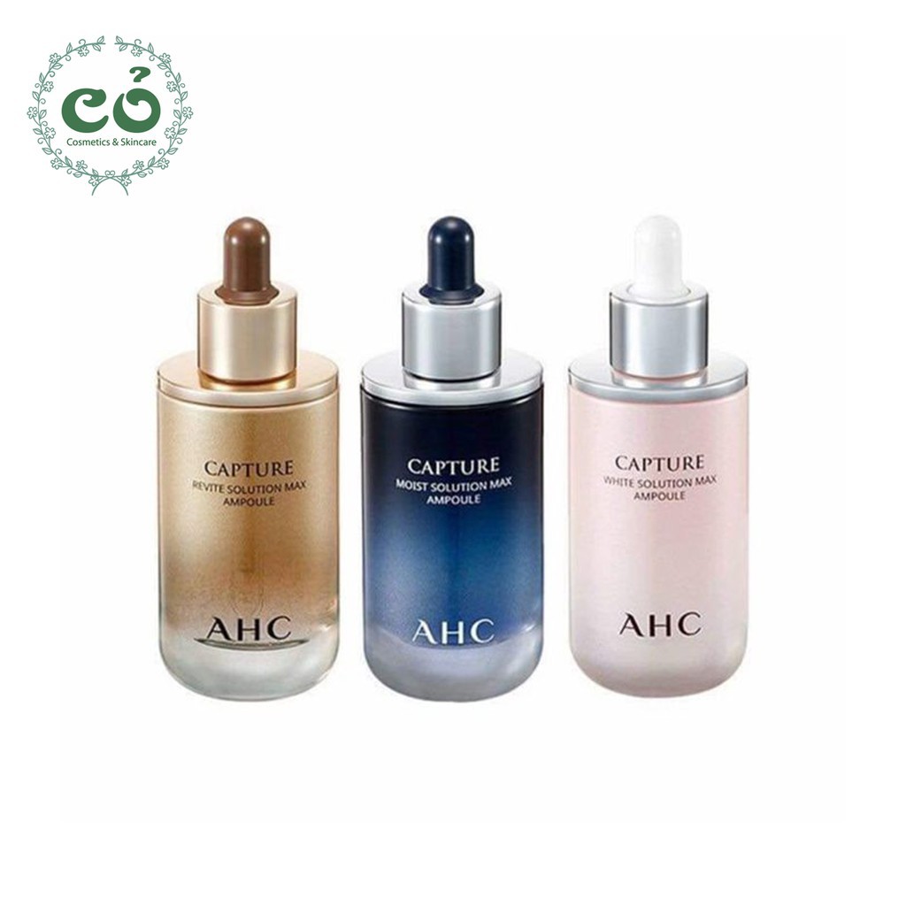 Tinh Chất Dưỡng Ẩm Trắng Da AHC Capture Solution Max Ampoule Dưỡng Ẩm – Trắng Da – Chống Lão Hóa – Xuất xứ: Hàn Quốc – Dung tích: 50ml Tinh Chất Dưỡng Ẩm Trắng Da AHC Capture Solution Max Ampoule với công thức bổ sung độ ẩm, peptide và hơn 20 loại chiết xuất thảo mộc khác nhau giúp nuôi dưỡng làn da thêm tươi sáng và khỏe mạnh. AHC Capture Solution Max Ampoule với 3 sản phẩm khác nhau phù hợp cho từng loại da: 1. XANH – MOIST: CẤP ẨM – SÁNG DA – Chứa Sodium Hyaluronate, Panthenol: giúp cấp ẩm, giữ ẩm và chống mất nước cho da – Niacinamide, Saccharomyces Ferment, Rice Ferment: làm trắng sáng và mịn da – Bifida Ferment, Adenosine: chống nhăn da hiệu quả – Chiết xuất 20 loại thảo mộc khác nhau: giúp cải thiện độ săn chắc da, đem đến làn da sáng bóng và căng mềm tươi sáng 2. HỒNG – WHITE: TRẮNG DA – CĂNG BÓNG – Chiết xuất Olive Fruit Oil, Squalane: cho làn da mềm mượt, sáng bóng – Ascorbic Acid, Galactomyces Ferment, Niacinamide: làm trắng sáng da hiệu quả – Bifida Ferment, Adenosine: chống nhăn da – Chiết xuất nhiều loại thảo mộc và quả cây bụi khác nhau: bổ sung hàm lượng vitamin tự nhiên làm sáng da và hỗ trợ dưỡng căng mềm, chống oxy hóa da tối ưu 3. VÀNG – REVITE: CHỐNG LÃO HÓA – TÁI SINH DA – DƯỠNG TRẮNG – Hydrolyzed Collagen: bổ sung collagen cho da, giữ làn da đàn hồi săn chắc và mịn màng – Tinh dầu hạt hướng dương, đậu lên men: cho bề mặt da mềm mướt, đàn hồi – Niacinamide và Adenosine: làm trắng và chống nhăn hữu hiệu – Bifida Ferment, Galactomyces Ferment cùng nhiều loại quả bụi và tinh dầu thảo mộc. —————— 45 Nguyễn Thượng Hiền, p5, q3 Website: http://cor.vn Facebook: Cỏ Cosmetics & Skincare Hotline: 0965528998 – 0929398899 ——————- ♥️ Cỏ Cosmetics & Skincare Cam kết mỹ phẩm chính hãng 100% Luôn có giá tốt nhất