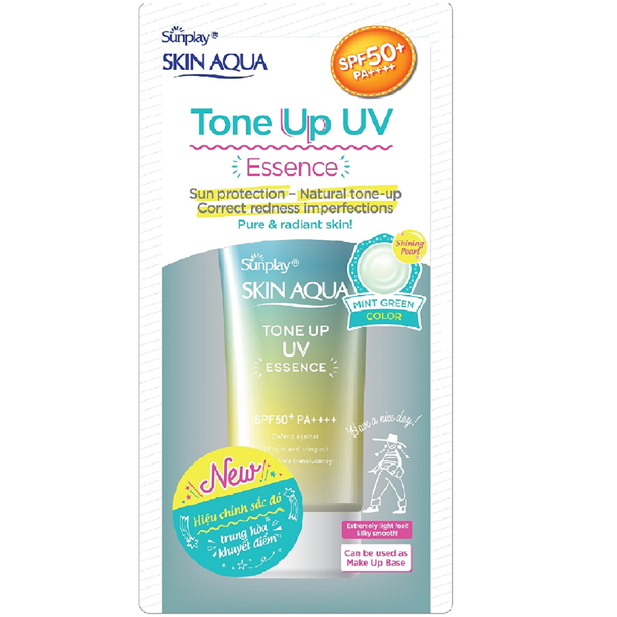 Chống mọi tia UV với SPF 50+ và PA++++ Nâng tông da sáng trong veo, rạng rỡ Hiệu chỉnh sắc da, che phủ tự nhiên với sắc xanh mint tươi mát Tạo hiệu ứng trong suốt 3D với các hạt ngọc trai siêu mịn Giữ ẩm và dưỡng sáng da với Hyaluronic Acid và Vitamin C Tinh chất chống nắng hiệu chỉnh sắc da Sunplay Skin Aqua Tone Up UV Essence – Mint Green Chống mọi tia UV – Che phủ tự nhiên Nâng tông da sáng trong veo, rạng rỡ Dùng hàng ngày, dành riêng cho da mặt CHÔNG NẮNG HIỆU QUẢ VỚI: – PA++++ tăng cường chống mọi loại tia UVA (gây đen sạm, nám, tàn nhang, nếp nhăn, đốm nâu,) – SPF50+ ngăn tia UVB (gây rát da, cháy nắng,). Dòng sản phẩm Chống nắng hiệu chỉnh sắc da che khuyết điểm Tone Up UV Mint Green có hai phiên bản: – Sunplay Skin Aqua Tone Up UV Essence: Dành cho mọi loại da, đặc biệt là da sáng, nhạy cảm, mẩn đỏ. – Sunplay Skin Aqua Tone Up UV Milk: Dành cho nhóm da dầu, da hỗn hợp, da thường; đặc biệt là da sáng, nhạy cảm ngay cả khi nổi mẩn đỏ. 1 – Hướng dẫn sử dụng: – Thoa đều sản phẩm trước khi ra nắng. – Dùng hàng ngày để bảo vệ da dưới tác động của tia UV hiệu quả. – Sau khi ra mồ hôi nhiều, thoa lại để hiệu quả chống nắng được duy trì. 2 – Lưu ý: – Không thoa lên vết thương hở hoặc bị bỏng. – Ngưng sử dụng và tham khảo ý kiến bác sĩ nếu có dấu hiệu dị ứng như: nổi mẩn đỏ, sưng, ngứa. 3 – Bảo quản: – Bảo quản nơi khô mát, tránh ánh nắng mặt trời trực tiếp chiếu vào. 4 – Thông tin thương hiệu: – Thương hiệu Sunplay – Xuất xứ thương hiệu: Nhật Bản – Nơi sản xuất: Việt Nam – Hạn sử dụng: 3 năm kể từ ngày sản xuất – Ngày sản xuất và số lô: Xem chi tiết trên bao bì.