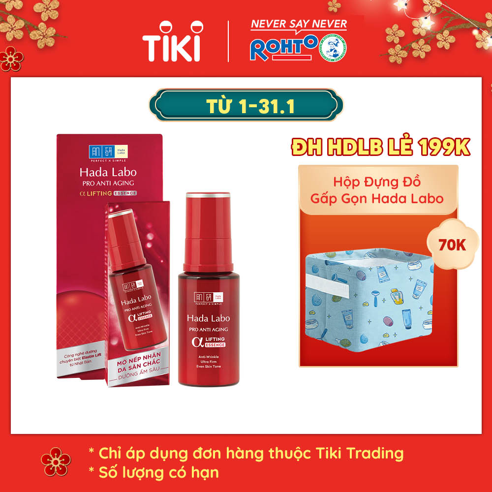 Bộ sản phẩm Tinh chất dưỡng chuyên biệt chống lão hóa Hada Labo Pro Anti Aging α Lifting Essence (30g), Thương hiệu Hada Labo Xuất xứ thương hiệu Nhật Bản Xuất xứ Việt Nam Hạn sử dụng 3 năm kể từ ngày sản xuất SKU 5025076284975.