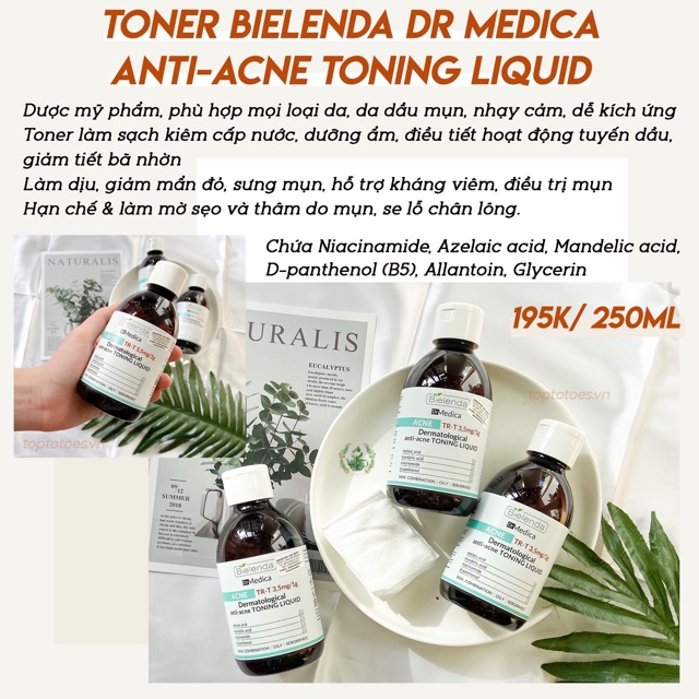 Toner trị mụn Bielenda Dr Medica Dermatological anti-acne Toning liquid là sản phẩm đang nổi như cồn trên thị trường trong nước và quốc tế. Bộ sản phẩm có giá chỉ ₫195.000 đã được bán ra hơn 438 đi kèm với 80 lượt yêu thích, cùng với đó là 186 lượt review, đánh giá, nhận xét về sản phẩm. Mô tả chi tiết bộ sản phẩm, quý khách vui lòng xem sau đây.