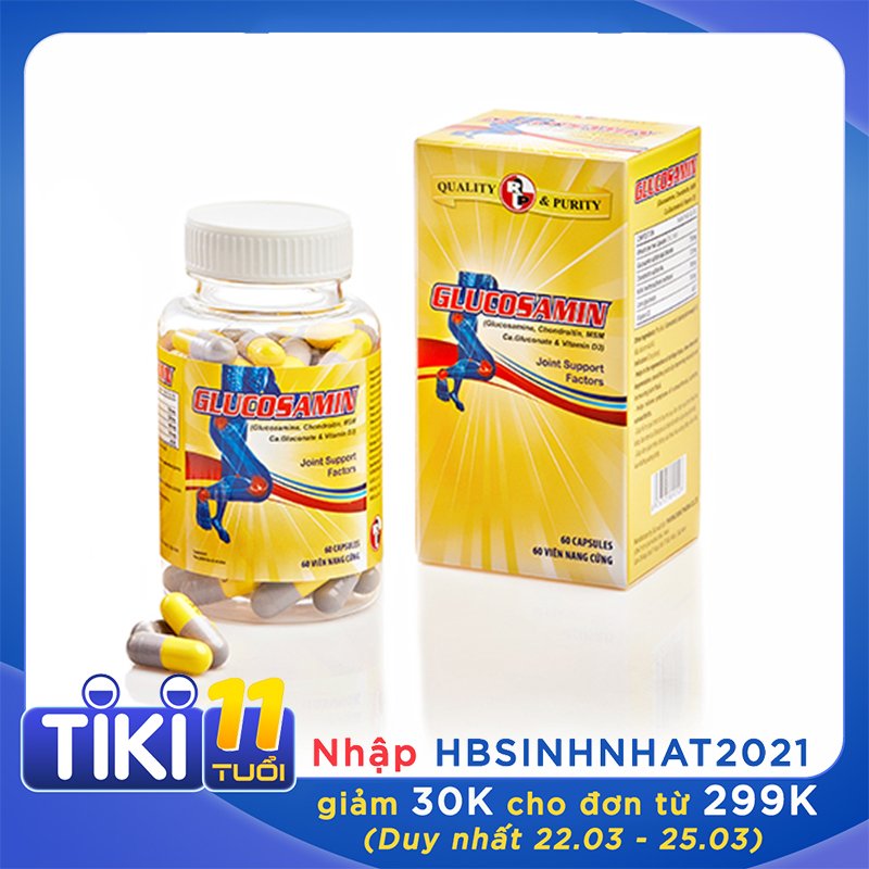 Phòng ngừa và hỗ trợ điều trị hiệu quả các bệnh về khớp như: viêm khớp, đau khớp gối, đau lưng, đau nhức các khớp xương, đau mỏi vai gáy, đau cột sống,… Hỗ trợ làm lành các khớp bị tổn thương, chấn thương do vận động, chơi thể thao. Bổ sung dưỡng chất giúp tăng dịch nhầy, tăng khả năng bôi trơn ở các ổ khớp, Giúp hạn chế quá trình thoái hóa khớp. Giúp phục hồi, tái tạo mô sụn. Trong cấu trúc khớp, sụn và xương dưới sụn là hai thành phần chính yếu, giúp con người duy trì chức năng vận động. Sụn đóng vai trò như miếng đệm bao bọc lấy đầu xương, ngăn không cho các đầu xương tiếp xúc trực tiếp với nhau, giúp chống sốc, điều chỉnh áp lực trong khoang khớp để khớp có thể vận động bình thường. n Thống kê của WHO: 0,3-0,5% dân số bị bệnh về khớp thì có 20% bị thoái hóa khớp (VN: 10,41%) n Tuổi càng cao càng dễ bị thoái hóa khớp: • 15-44 tuổi : 5% người bị thoái hóa khớp. • 45-64 tuổi: 25-30% người bị thoái hóa khớp • 65 tuổi: 60-90 % người bị thoái hóa khớp Tỉ lệ nữ bị thoái hóa khớp nhiều hơn nam ( 2/3) Thoái hóa khớp là gì? Thoái hóa khớp là bệnh mãn tính, biểu hiện toàn bộ tổn thương khớp mà yếu tố chủ chốt là sự thoái hóa của các sụn khớp kèm với sự thiếu hụt sửa chữa của mô sụn, và sự tái tạo của các xương dưới sụn. Hình ảnh khớp bình thường và khớp thoái hóa n Thoái hóa khớp thường xảy ra ở người cao tuổi, nhưng hiện nay tỷ lệ đang gia tăng ở cả người trẻ tuổi. n Thoái hóa khớp là bệnh lý thường gặp, gây nhiều hậu quả , làm giảm chất lượng cuộc sống. Nhưng có thể phòng bệnh. Phòng bệnh thoái hóa khớp như thế nào? – Duy trì trọng lượng cơ thể, tránh dư cân, béo phì – Tập vận động thường xuyên và vừa sức – Giữ tư thế cơ thể luôn thẳng và cân bằng – Bổ sung dưỡng chất như: Glucosamin,Chondroitin, MSM, Calcium ( canxi) giúp bồi bổ sụn khớp, tăng tái tạo sụn. Hình ảnh mô tả thành phần sụn khớp Sự kết hợp giữa Glucosamin , Chondroitin và MSM giúp bảo vệ khớp , có tác dụng duy trì và tái tạo sụn khớp, hỗ trợ điều trị cho các trường hợp như: Thoái hóa xương khớp, viêm quanh khớp, loãng xương, viêm khớp cấp và mãn tính,… • Tăng cường sản xuất dịch nhầy để giúp khớp hoạt động linh hoạt, giảm tình trạng cứng khớp, đau nhức. • Kích thích tái tạo mô sụn, tái tạo sụn khớp, từ đó duy trì sụn khớp khỏe mạnh, tránh bị hao mòn, tổn thương bởi gốc tự do. • Duy trì hoạt động bình thường của xương khớp. Thành phần chính của viên nang Glucosamin – Robinson Pharma Usa · Glucosamin sulfate kali chloride…………………………………….. 750 mg · Chondroitin sulfate Na…………………………………………………. 120 mg · MSM (methylsulfonyl methane)…………………………………….. 100 mg · Canxi gluconate………………………………………………………….. 150 mg · Vitamin D3………………………………………………………………….. 40 IU Công dung chính của viên nang Glucosamin – Robinson Pharma Usa § Giúp hỗ trợ quá trình tái tạo mô sụn, làm chậm quá trình thoái hóa khớp, làm trơn các ổ khớp do cải thiện độ nhớt và làm tăng dịch khớp § Giúp làm giảm triệu chứng của thoái hóa xương khớp, viêm khớp, loạn dưỡng xương khớp. Hướng dẫn sử dụng viên nang Glucosamin – Robinson Pharma Usa ► Liều dùng: Thiếu niên, người trưởng thành: uống 2-3 lần/ngày x 1viên/lần. ► Đối tượng sử dụng: · Người bị thoái hóa xương khớp, khô khớp, đau mỏi khớp, vận động khó khăn. · Người trưởng thành, người cao tuổi đi lại khó khăn sau phẫu thuật xương khớp. · ► Bảo quản: Bản quản nơi khô ráo, tránh ánh nắng, tránh nhiệt độ quá cao trên 30 độ C ►Lưu ý: · Sản phẩm này không phải là thuốc và không dùng thay thế thuốc chữa bệnh · Hiệu quả sử dụng Glucosamine còn tùy thuộc vào cơ địa của mỗi người. Sản phẩm không thay thế thuốc chữa bệnh, không có tác dụng giảm đau tức thời,