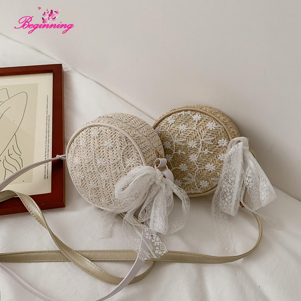 Bộ sản phẩm: Túi cói dáng tròn đeo vai thiết kế vintage thanh lịch cho nữ.