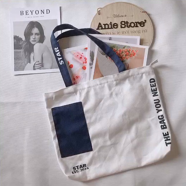 Bộ sản phẩm: Túi Tote Dáng Thể Thao Tủi Vải Quai Xách In Start Unisex.