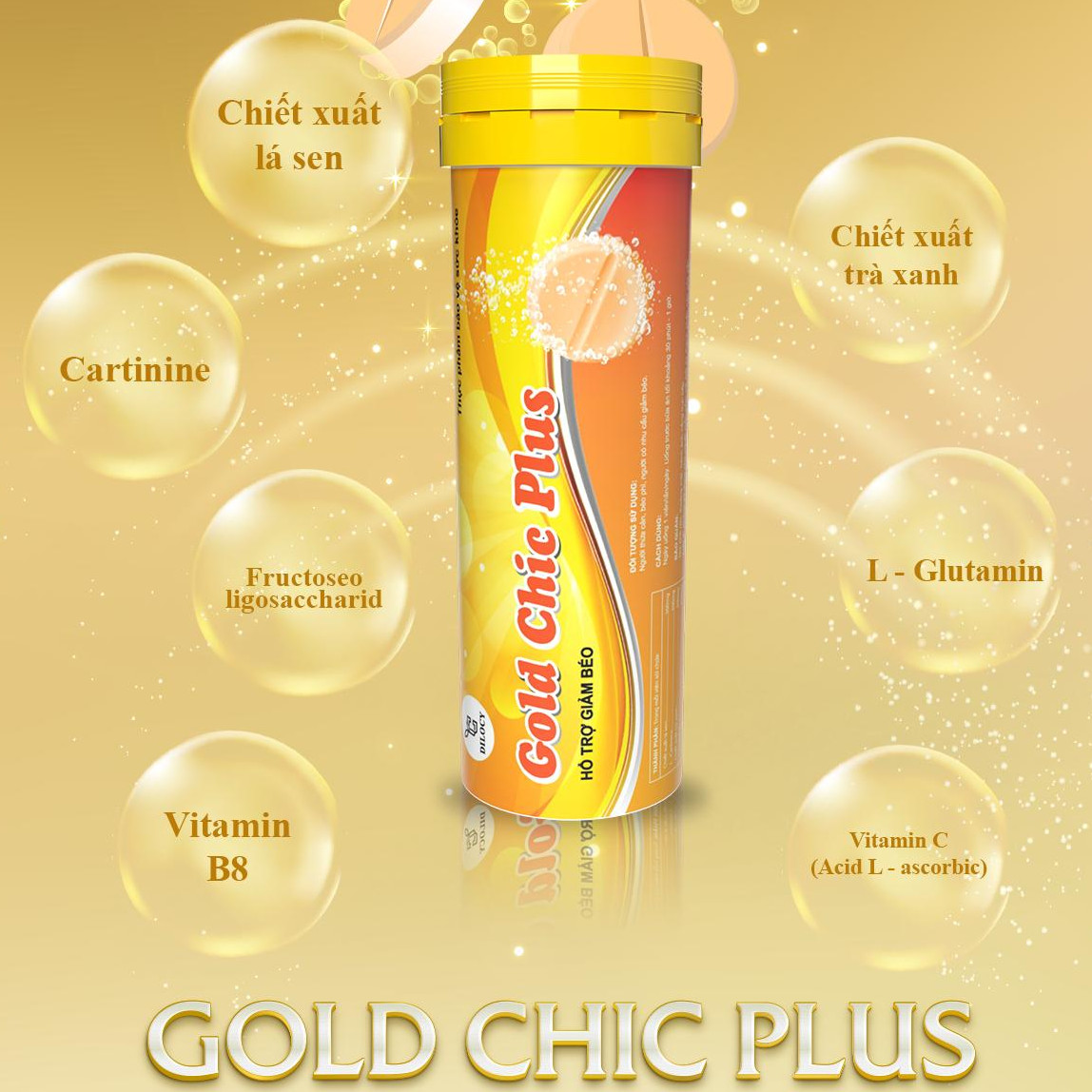 Viên sủi hỗ trợ giảm cân có vị cam thơm ngon. Chiết xuất từ các thành phần thảo mộc như lá sen, trà xanh, L carnitine, Vitamin C Thích hợp dùng vào buổi chiều để ngăn tích trữ mỡ, giảm thèm ăn buổi chiều tối Đạt hiệu quả cao nhất khi dùng kèm combo hỗ trợ Giảm cân Dilocy Gold Chic Plus Ngày và Đêm Công nghệ sản xuất bằng dây chuyền hiện đại, khép kín, đạt chuẩn chất lượng GMP phân phối ra thị trường Đối với người đang trong giai đoạn giảm cân thì buổi chiều tối là thời gian khó khăn nhất. Sau thời gian làm việc mệt mỏi, cơ thể cần phải bổ sung năng lượng từ thức ăn hoặc nước dẫn đến dễ bị nhạt miệng, thèm ăn và ăn nhiều vào bữa tối, tạo ra trở ngại rất lớn trong công cuộc giảm cân để có vóc dáng gọn gàng, khoẻ đẹp. Hiểu được điều đó, viên sủi hỗ trợ giảm cân Dilocy đã được nghiên cứu và phát triển để giúp việc giảm cân trở nên dễ dàng hơn bao giờ hết. Viên sủi Dilocy Gold Chic Plus có vị cam thơm ngon, ngọt nhẹ và tan nhanh trong nước phần nào sẽ giúp bạn giảm bớt cảm giác nhạt miệng, thèm ăn. Thành phần đông y có trong viên sủi còn giúp hạn chế hấp thu chất béo, ngăn chặn tích mỡ từ bữa ăn chiều. Một viên mà lợi cả đôi đường. Dùng sản phẩm này kèm theo , cả cơ thể đều được hỗ trợ giảm cân một cách tốt nhất. Lọ : 10 viên – Thành Phần Cấu Tạo Chiết xuất lá sen 300mg L –Cartinine 300mg chiết xuất trà xanh 200mg L-Glutamin 200mg Vitamin B8 150mg Vitamin C (Acid L-ascorbic) 100mg Fructoseoligosaccharid 100mg Phụ liệu : Glucokhan, sodium bicarbonat , sodium benzoat, acid citric, hương liệu tổng hợp vừa đủ 1 viên – Công dụng: Hỗ trợ tăng cường chuyển hóa chất béo trong cơ thể, hỗ trợ giảm béo.Đào thải mỡ thừa trong cơ thể . – Đối tượng sử dụng: Ngừa thừa cân, béo phì, người có nhu cầu giảm béo. – Cách dùng: Ngày uống 1 lần – 1 viên. Uống trước bữa ăn vào buổi chiều – Cảnh báo về sức khỏe: Lưu ý: Không sử dụng cho người mẫn cảm với bất kỳ thành phần nào của sản phẩm. Không dùng cho người dưới 18 tuổi, phụ nữ có thai, cho con bú, người bị tiểu đường. Không sử dụng cho người có tiền sử tim mạch, huyết áp. Kết hợp ăn chế độ ít tinh bột, chất béo, đồ ngọt, tăng cường vận động. Thực phẩm này không phải là thuốc, không có tác dụng thay thế thuốc chữa bệnh. Thời hạn sử dụng: 36 tháng kể từ ngày sản xuất. Ngày sản xuất và Hạn sử dụng in trên bao bì. Hướng dẫn bảo quản: Nơi khô ráo, thoáng mát, tránh ánh nắng trực tiếp, nhiệt độ không quá 30 độ C . Để xa tầm tay trẻ em .