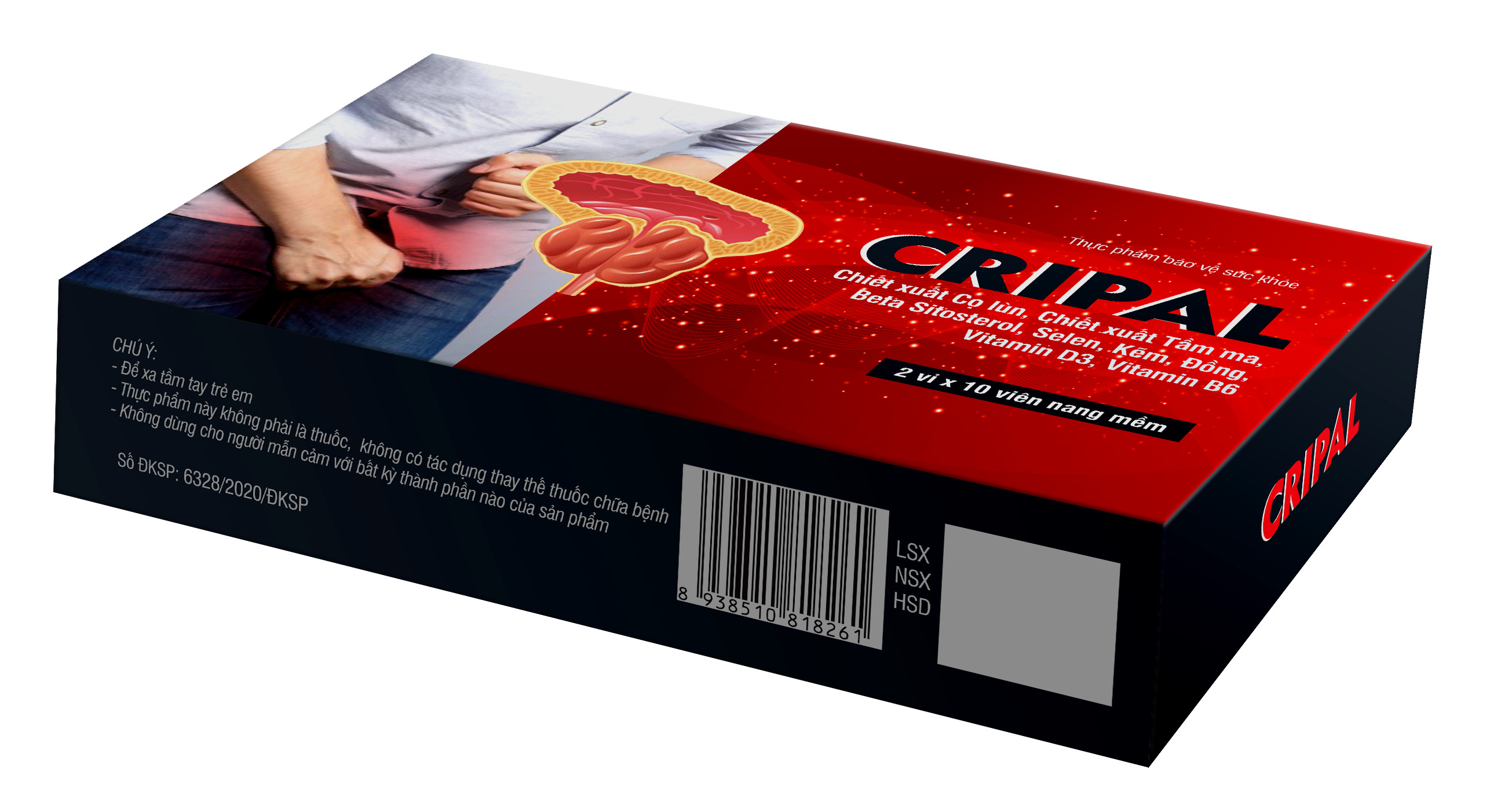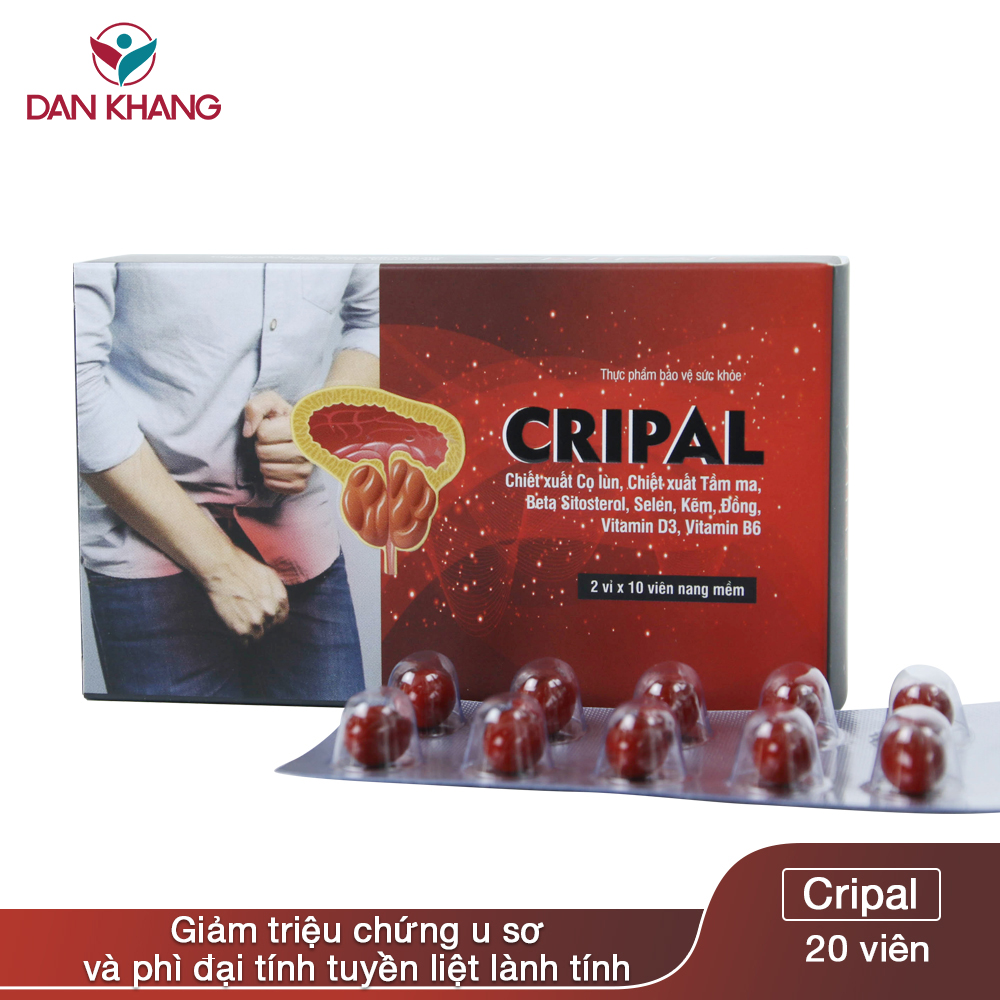 Một trong những căn bệnh thường gặp ở nam giới đó là u xơ tiền liệt tuyến hay còn gọi là phì đại lành tính tuyến tiền liệt. Căn bệnh này gây nhiều khó khăn trong sinh hoạt và làm cho chất lượng cuộc sống của các quý ông ngày càng đi xuống như: tiểu không hết, tiểu tiện khó, tiểu són, tiểu ngập ngừng. Nay đã có Cripal giải pháp mới giúp hỗ trợ các triệu chứng của u xơ và phì đại lành tình tuyến tiền liệt với thành phần từ 100% thảo dược thiên nhiên an toàn và lành tính. Thành phần có trong sản phẩm Cripal Trong 1 viên nang mềm Cripal có chứa: Saw Palmetto Extract (chiết xuất Cọ lùn): 180mg Stinging Nettle Extract (chiết xuất Tầm ma): 50mg Men tăng sinh từ Sellen 2000ppm: 10mg Beta Sitosterol: 70mg Kẽm (dạng Kẽm gluconate): 7,5mg Đồng (dạng Đồng gluconate): 3,5mg Vitamin B6 (dạng Pyridoxine hydrochloride): 2,5mg Vitamin B3 (dạng Cholecalciferol): 40mcg Phụ liệu: gelatin, glycerin, chất tạo ngọt: sorbitol vừa đủ 1 viên. Sản phẩm Cripal phù hợp cho người bị phì đại tuyến tiền liệt Cripal chứa các chiết xuất thảo mộc, vitamin và vi lượng giúp hỗ trợ hiệu quả các tình trạng u xơ, phì đại lành tính tuyến tiền liệt ở nam giới. Saw Palmetto Extract (chiết xuất Cọ lùn): Được sử dụng phổ biến tại Châu Âu như liệu pháp tự nhiên điều trị bệnh phì đại tuyến tiền liệt. Các nghiên cứu chỉ ra rằng chiết xuất Cọ lùn có tác dụng ức chế 5α-reductase, giúp cải thiện tình trạng phì đại tuyến tiền liệt. Stinging Nettle Extract (chiết xuất Tầm ma): Chứa các phytosterol lignans và polysaccharides. Thử nghiệm lâm sàng đăng trên Tạp chí thảo dược học năm 2005 trên 287 bệnh nhân cho thấy sử dụng Chiết xuất Tầm ma giúp giảm kích thước tuyến tiền liệt, điểm triệu chứng tuyến tiền liệt quốc tế (IPSS) và kháng nguyên đặc hiệu tuyến tiền liệt trong huyết tương (PSA). Ngoài ra, nghiên cứu tại Đại học Hồi giáo Azad tại Iran năm 2011 trên 100 bệnh nhân cũng cho thấy hiệu quả giảm các triệu chứng phì đại tiền liệt tuyến sau 8 tuần sử dụng. Beta Sitosterol: Còn được gọi là Sterol Ester thực vật, Beta sitostosterol giúp giảm cholesterol trong máu, cải thiện các triệu chứng của phì đại tuyến tiền liệt. Selen, Kẽm, Đồng, Vitamin D3, Vitamin B6: Là các vitamin và vi lượng quan trọng giúp cải thiện các triệu chứng của u xơ và phì đại lành tính tuyến tiền liệt. Đồng thời giúp giảm nguy cơ phì đại tuyến tiền liệt. Đối tượng sử dụng và cách dùng Đối tượng sử dụng: Nam giới bị u xơ, phì đại lành tính tuyến tiền liệt gây tiêu không hết, tiểu tiện khó. Cách dùng: 2viên/ ngày, ngay sau bữa ăn Bảo quản: Nơi khô mát, tránh ánh nắng trực tiếp. Tiêu chuẩn: TCCS Chú ý: Để xa tầm tay trẻ em. Thực phẩm này không phải là thuốc, không có tác dụng thay thế thuốc chữa bệnh. Không dùng cho người mẫn cảm với bất kì thành phần nào của sản phẩm.