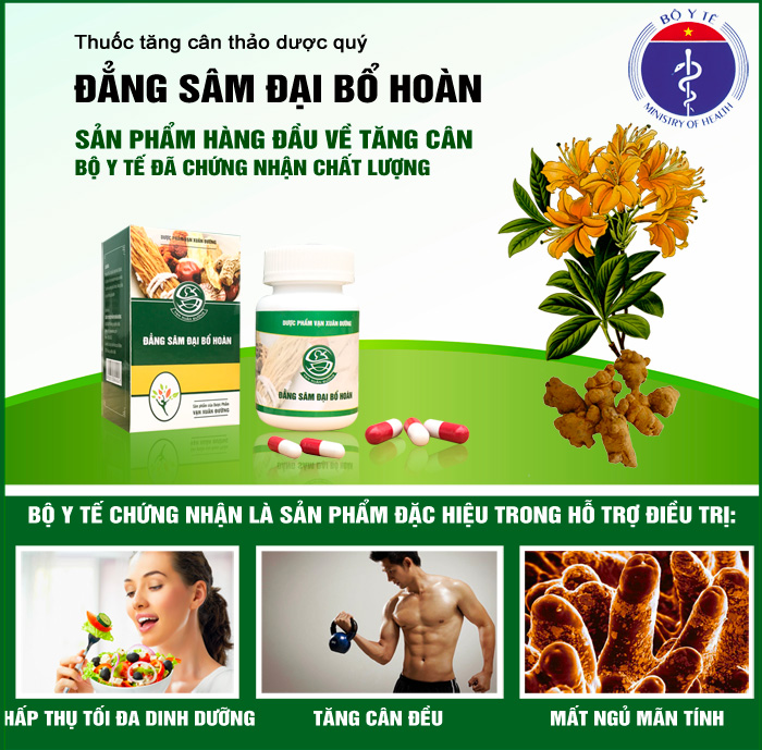Giúp Tăng cân cho người gầy, tăng cân nhanh và an toàn. Giúp tăng cân tự nhiên, tăng cân tăng cơ. Giúp ăn ngon, ngủ ngon, tăng cường sức đề kháng, giảm mệt mỏi, suy nhược cơ thể. Bồi bổ nguyên khí, Tăng cường sinh lực, tăng cân hiệu quả Tạng tỳ hoạt động ổn định trở lại. Giúp tiêu hóa tốt, hấp thu tối đa dưỡng chất Lớp lông trong thành ruột non phục hồi chức năng hấp thu và mọc thêm tự nhiên Giảm căng thẳng thần kinh CÔNG DỤNG: Giúp Tăng cân cho người gầy, tăng cân nhanh và an toàn. Giúp tăng cân tự nhiên, tăng cân tăng cơ. Giúp ăn ngon, ngủ ngon, tăng cường sức đề kháng, giảm mệt mỏi, suy nhược cơ thể. Bồi bổ nguyên khí, Tăng cường sinh lực, tăng cân hiệu quả Tạng tỳ hoạt động ổn định trở lại. Giúp tiêu hóa tốt, hấp thu tối đa dưỡng chất Lớp lông trong thành ruột non phục hồi chức năng hấp thu và mọc thêm tự nhiên Giảm căng thẳng thần kinh THÀNH PHẦN: Cao Khô Đẳng Sâm ……………………………. 60 mg Cao Khô Cam Thảo ..……………….…………. 20 mg Cao Khô Bạch Truật ……………………….…. 50 mg Cao Khô Thục Địa …………………………… 50 mg Cao Khô Đương Quy …………………………….. 40 mg Cao Khô Bạch Thược …………………………… 50 mg Cao Khô Hoàng Kỳ ………………………………..30 mg Phụ Liệu: Bột Talc, Canci Carbonat vừa đủ 1 viên. ĐỐI TƯỢNG SỬ DỤNG: Người muốn tăng cân, tăng cơ Người mệt mỏi, suy nhược cơ thể, chán ăn, khó ngủ. CÁCH DÙNG: Hỗ trợ điều trị: Ngày 2 lần, mỗi lần 4 viên, trước ăn 60 phút. Phòng bệnh, bảo vệ sức khỏe: Ngày 2 lần, mỗi lần 2 viên, trước ăn 60 phút. Nên dùng từ 1-2 tháng để có hiệu quả tốt nhất. QUY CÁCH ĐÓNG GÓI: Lọ 60 viên. THỜI HẠN SỬ DỤNG: 3 năm kể từ ngày sản xuất.. ************************************************************ THÔNG TIN THÊM: – Sản phẩm ăng cân thảo dược Đẳng Sâm Đại Bổ Hoàn được phát triển thành công từ năm 2008 do nhà thuốc đông y Vạn Xuân Đường hợp tác cùng tập thể hơn 10 PGS, tiến sỹ đầu ngành chuyên khoa tiêu hóa – tỳ vị tham gia nghiên cứu trong nhiều năm. – Sản phẩm được các tổ chức y tế, các bác sĩ dinh dưỡng đánh giá rất cao về hiệu quả trong việc bồi bổ nguyên khí và hấp thu dưỡng chất tối đa giúp tăng cân. sản phẩm được bào chế hoàn toàn 100% từ thảo dược thiên nhiên quý, tuyệt đối an toàn, không tác dụng phụ, rất phù hợp với thể trạng và cơ địa của người Việt Nam. NGUỒN GỐC CỦA THẢO DƯỢC TĂNG CÂN : ĐẲNG SÂM ĐẠI BỔ HOÀN Năm 1731 công nguyên, Càn Long khi đó 20 tuổi, ông là thái tử của vua Ung Chính, Nhưng ông có một thân thể gầy gò, ốm yếu nên ông lo lắng rằng sau này vua cha sẽ không chọn mình là người kế vị. Ông đã tuyển rất nhiều thái y đến hỗ trợ chữa trị nhưng tình hình cũng không khả quan, ông vẫn gầy gò như lúc đầu. Lý Mã Hoan ( một trong những thái y thân cận được Càn Long tin tưởng nhất bấy giờ) đã mất gần 1 năm liền để đến các vùng cao nguyên Tây Tạng và các dải núi cao Mông Cổ để mang về 4 loại thần dược cho Càn Long đó chính là: Đẳng Sâm, Hoàng Kỳ, Đương Quy, Bạch Truật. Từ đó Càn long trở lên béo tốt, ông lên ngôi hoàng đế và biến Trung Hoa trở thành một Trung Hoa cực thịnh thời đó. Sau này Càn Long đã trở thành vị hoàng đế có tuổi thọ cao nhất trong tất cả các vị Hoàng Đế Trung Quốc (87 tuổi), và đến năm 75 tuổi ông vẫn sinh thêm 1 nàng công chúa cùng với phi tần của mình là Thụy Quý Nhân, tất cả nhờ phương thuốc “Đại Bổ” này. Hàng trăm năm sau các anh hùng Trung Hoa vẫn truyền tai nhau phương thuốc bí truyền này để giúp họ có sức mạnh phi thường. Cho đên ngày nay thì VẠN XUÂN ĐƯỜNG đã cải biên cho vào trong thành phần hơn 10 vị dẫn và thêm một vài thảo dược quý hiếm khác để làm bổ trợ, tăng thêm sức mạnh của sản phẩm. Tạo nên sản phẩm ĐẲNG SÂM ĐẠI BỔ HOÀN đã được kiểm chứng về chất lượng hỗ trợ điều trị rất tốt như hiện nay.
