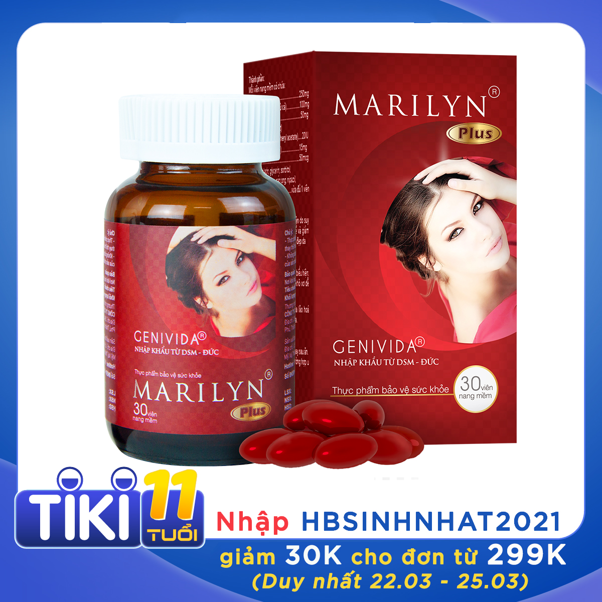 Hoạt chất Genivida từ DSM – Thụy Sĩ cân bằng nội tiết tố hiệu quả hơn hẳn tinh chất mầm đậu nành thông thường. Tăng cường sinh lý nữ, làm chậm và giảm các dấu hiệu lão hoá. Collagen, Vitamin E, Omega 3, Biotin làm sáng mịn da, giảm nám, nuôi dưỡng tóc chắc khỏe, óng ả. Hiệu quả sau 45 NGÀY. Được kiểm nghiệm lâm sàng và chứng nhận từ Bộ Y tế. Với sự kết hợp giữa các thành phần cải thiện nội tiết tố nữ và làm đẹp da cao cấp, Viên uống Cân Bằng Nội Tiết Tố, Cải Thiện Sinh Lý Marilyn là giải pháp hàng đầu dành cho phụ nữ trong giai đoạn tiền mãn kinh, mãn kinh, phụ nữ sau sinh và rối loạn nội tiết tố nữ. Không chỉ cải thiện sinh lý nữ, sản phẩm còn giảm thiểu các triệu chứng của tiền mãn kinh, mãn kinh như mất ngủ, bốc hỏa, rụng tóc, lo â, đồng thời làm đẹp da, mờ thâm nám và bảo vệ tim mạch. HIỆU QUẢ RÕ RỆT CHỈ SAU 45 NGÀY SỬ DỤNG! GENIVIDA BÍ MẬT TẠO NÊN SỨC QUYẾN RŨ CỦA PHÁI ĐẸP Để cải thiện các vấn đề liên quan đến nội tiết, thông thường người ta sẽ nghĩ đến mầm đậu nành, bởi trong thành phần của nó có chứa genistein, một chất có tác dụng cân bằng nội tiết tố và cải thiện các vấn đề về sinh lý nữ. Tuy nhiên, bằng công nghệ vượt trội, các nhà khoa học đã tạo nên một thành phần mạnh mẽ và hiệu quả hơn nhiều so với mầm đậu nành truyền thống, đó là Genivida. Nếu hàm lượng genistein trong mầm đậu nành chỉ chiếm 5% thì Genivida chứa đến >98,5% genistein, gấp 20 lần hàm lượng trong mầm đậu nành, do đó mang đến hiệu quả vượt trội và nhanh hơn hẳn. THÀNH PHẦN CỦA VIÊN UỐNG CÂN BẰNG NỘI TIẾT TỐ, CẢI THIỆN SINH LÝ NỮ MARILYN Genivida: nhập khẩu từ hãng dược nổi tiếng DSM Thụy Sĩ, được các chuyên gia hàng đầu trên thế giới công nhận hiệu quả vượt trội trong việc cải thiện các triệu chứng: khô hạn, giảm ham muốn, khó ngủ, bốc hỏa, căng thẳng, loãng xương, bệnh tim mạ cho phụ nữ. Fish Collagen: nhập khẩu từ Ý, giúp phục hồi cấu trúc da, trẻ hóa da, dưỡng ẩm và chống khô da, làm mờ nếp nhăn, chống lão hóa. Omega 3: dưỡng ẩm da, hỗ trợ hoạt động của hệ thần kinh và thị lực, tăng cường trí nhớ, bảo vệ hệ tim mạch, hạn chế nguy cơ mắc các chứng xơ vữa mạch, rối loạn nhịp Vitamin E tự nhiên: chống lại quá trình lão hóa, duy trì làn da và vóc dáng trẻ trung, giúp da tóc mịn màng, giúp noãn (trứng) phát triển. Biotin: tăng cường sức khỏe cho tóc và móng, giảm tình trạng rụng tóc. CÔNG DỤNG CỦA VIÊN UỐNG CÂN BẰNG NỘI TIẾT TỐ, CẢI THIỆN SINH LÝ NỮ MARILYN Giúp cải thiện sinh lý nữ. Làm chậm quá trình mãn kinh, giảm triệu chứng khó chịu giai đoạn tiền mãn kinh: bốc hỏa, mất ngủ, căng thẳng, mệt mỏ Giúp da sáng mịn, giảm nám (do nội tiết tố). Tăng cường độ chắc khỏe cho tóc và móng tay. Hỗ trợ bảo vệ tim mạch và xương khớp. ĐỐI TƯỢNG SỬ DỤNG Phụ nữ tiền mãn kinh, mãn kinh, suy giảm sinh lý dẫn tới các triệu chứng: khô hạn, bốc hỏa, mất ngủ, giảm ham muốn, tiểu đê Phụ nữ da khô, nhăn, sạm da, rụng tóc HƯỚNG DẪN SỬ DỤNG Dùng 2 viên/lần/ngày sau khi ăn. Nên sử dụng đủ liệu trình 3 hộp để cảm nhận rõ hiệu quả. Sau khi đã cải thiện hoàn toàn các triệu chứng, có thể chuyển sang liều 1 viên/ngày để duy trì hiệu quả liên tục hơn. MÔ TẢ SẢN PHẨM Hộp thủy tinh 30 viên nang mềm.