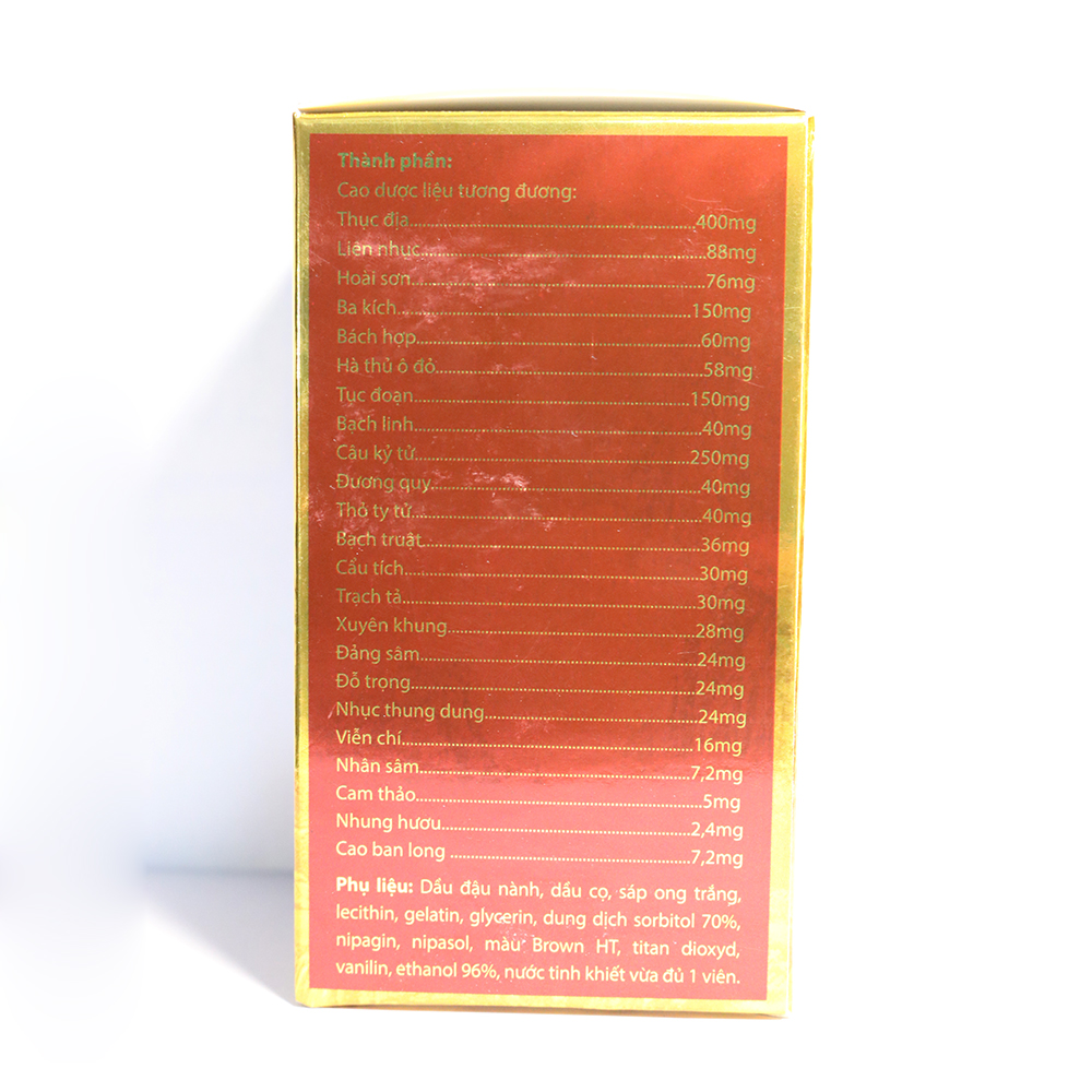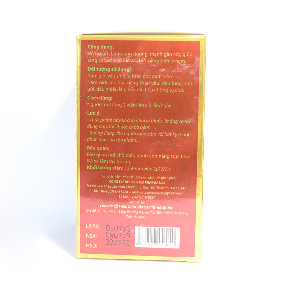 Được Bộ Y Tế cấp phép sản xuất Sản xuất đạt chuẩn GMP Bộ Y Tế Sản xuất tại nhà máy dược HDPharma với hơn 50 năm kinh nghiệm, một trong những nhà máy đạt chuẩn GMP tốt nhất Việt Nam Bào chế từ 23 loại thảo dược đông y: Tinh chất nhân sâm, lộc nhung, ba kích, cầu kỳ tử, Nhục thung dung … 100% dược liệu thiên nhiên, tác dụng nhanh chóng Bổ thận, tráng dương, sinh tinh, mạnh gân cốt Tăng cường sinh lý nam giới Tăng testosterone, giảm quá trình mãn dục nam Giảm đau mỏi lưng gối Hộp 30 viên Tác dụng nhanh chóng, an toàn khi sử dụng lâu dài BỔ THẬN NAM TĂNG CƯỜNG SINH LÝ NAM, BỔ THẬN TRÁNG DƯƠNG Bổ thận, tráng dương, sinh tinh, tăng chất lượng tinh trùng Tăng cường khả năng sinh lý nam giới Tăng ham muốn, kéo dài thời gian quan hệ Hỗ trợ cải thiện khả năng sinh sản ở nam giới Tăng testosterone, giảm quá trình mãn dục ở nam giới Mạnh gân cốt, giảm đau lưng mỏi gối Giúp cho nam giới luôn sung mãn, cuộc sống như ý ƯU DIỂM CỦA TĂNG CƯỜNG SINH LÝ NAM BỔ THẬN NAM THÀNH PHẦN CHÍNH VÀ CÔNG DỤNG BỔ THẬN NAM Thục địa: là vị chủ lực của nhiều sản phẩm bổ thận, hiệu quả tăng cường sức khỏe, đặc biệt sức khỏe sinh lý. Tăng tác dụng bổ thận, bổ huyết, hiệu quả trong cải thiện tình trạng sinh lý yếu, yếu thận, mệt mỏi, di tinh, mộng tinh. Ba kích: Tác dụng ôn thận, trợ dương, mạnh gân cốt. Hỗ trợ chữa chứng đau lưng, tê chân, mỏi gối. Tục đoạn: Chữa thận hư, lưng đau, chân yếu, gẫy xương. Câu kỳ tử: dược liệu bổ toàn thân, bổ can thận, mạnh gân cốt. Chữa chân tay yếu mỏi, mắt mờ, di mộng tinh. Nhục thung dung: Tác dụng bổ thận,ích tinh, huyết. Dùng cho nam giới liệt dương, lưng gối lạnh đau, cơ bắp không có sức, huyết khô, tiện bí… Nhân sâm: chứa nhiều ginsenoside giúp cải thiện và tăng đáng kể hàmlượng testosterone ở nam giới, làm tăng cảm giác hung phấn, tăng cường sinh lý nam. Nhung hươu: Bổ thận, cường dương, sinh tinh. Tăng cường sức mạnh cơ bắp. Cao Ban long: Tăng cường chức năng sinh lý, cường dương, sinh tinh, chữa di tinh, mộng tinh, xuất tinh sớm. Mạnh gân cốt. ĐỐI TƯỢNG SỬ DỤNG Nam giới trưởng thành yếu sinh lý, mãn dục nam sớm. Nam giới có chức năng thận yếu. Người hay ay đau lưng, mỏi gối, tiểu nhiều lần, tiểu rắt, tiểu không tự chủ. CÁCH SỬ DỤNG HIỆU QUẢ Uống tăng cường : Uống 2 viên/lần, 2 lần/ngày. Uống duy trì : 1 viên/ lần, 2 lần/ngày LƯU Ý KHI SỬ DỤNG Bảo quản nơi khô ráo thoáng mát, tránh ánh nắng Thực phẩm này không phải là thuốc, không có tác dụng thay thế thuốc chữa bệnh