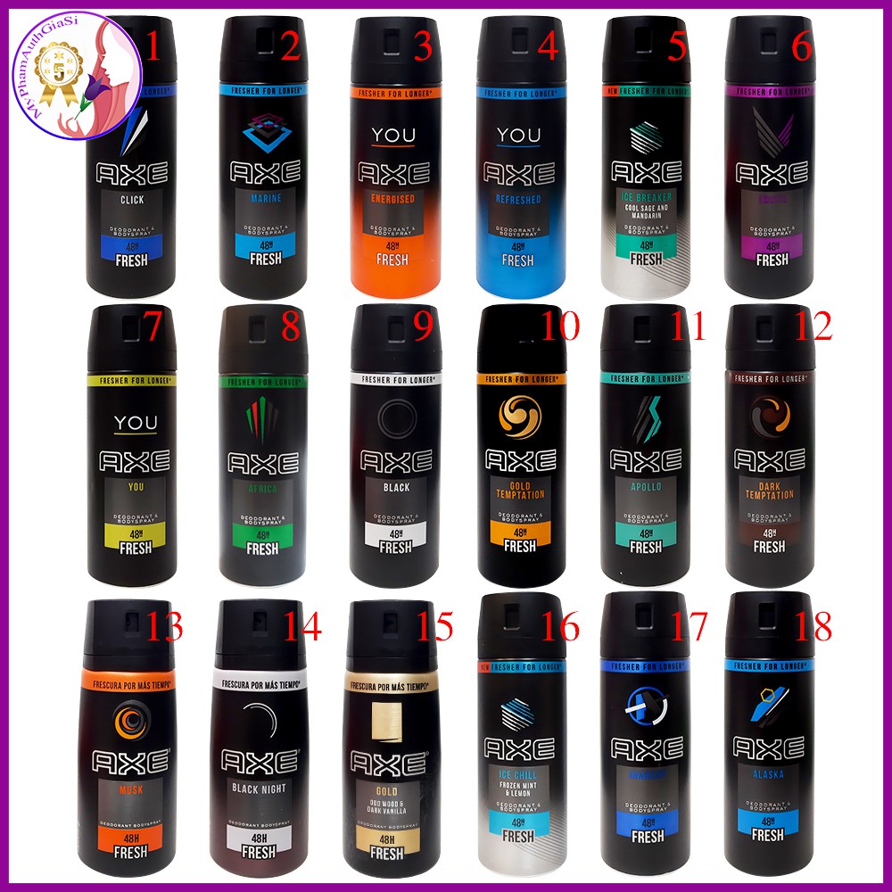 XỊT KHỬ MÙI AXE NAM TÍNH MẠNH MẼ MADE IN EURO 150ML  Dung tích dung dịch: 150ml  Xuất Xứ: Hà Lan, Ba Lan, Pháp  Thương Hiệu: AXE XỊT KHỬ MÙI AXE NAM TÍNH MẠNH MẼ MADE IN EURO 150ML Thành Phân Công Dụng  Ưu điểm của Axe Body Spray  Ngăn tiết mồ hôi vượt trội, giúp bạn khô thoáng và sạch sẽ cả ngày.  Ngăn ngừa mùi cơ thể hiệu quả, cho bạn thoải mái chơi thể thao hay làm việc ngoài trời mà không còn sợ mùi cơ thể khó chịu.  Mang lại cảm giác sảng khoái, mát lạnh ngay tức thời, để bạn có thể tự tin, chủ động trong mọi tình huống.  Mùi hương đầy nam tính, mạnh mẽ và rất thu hút.  Xịt khử mùi Axe có thiết kế bắt mắt và ấn tượng, đầy mạnh mẽ. Dạng xịt giúp nam giới sử dụng nhanh chóng và dễ dàng hơn. Loại da phù hợp Sản phẩm thích hợp với mọi loại da. Hương được phân thành những nhóm tượng trưng: 1. Hương thơm mát: Dark Temptation, Black, Black Night, Peace, Anarchy, Excite, You, Wild Spice, Adrenalin, Ice chill, Ice Breaker, You-Refreshed 2. Mạnh mẻ, nồng nàn: Musk, Marine, Africa, Gold Temptation, You 3. Thể thao: Click, Apollo, Sport Blast, Alaska, You-Energised Hướng Dẫn Sử Dụng:  Tắm sạch sẽ cơ thể rồi lau khô.  Đặt bình xịt cách cơ thể khoảng 15cm và xịt đều một lượng vừa đủ.  Chờ một lát cho sản phẩm khô, sau đó mới mặc áo vào.  Bảo quản nơi khô ráo, thoáng mát, tránh tiếp xúc với lửa.  Không xịt vào mắt hay những vùng có vết thương hở. Lưu ý: Chỉ sử dụng ngoài da. Nếu vào mắt, rửa sạch bằng nước. Để xa tầm tay của trẻ. Bảo quản: Để sản phẩm nơi khô ráo và thoáng mát. ————————————– #xitkhumuiaxenamtinhmanhmehalan #xitkhumuitoanthannamaxe #xitkhumuinamtinhmanhmeaxe #xitkhumuinamaxe #xitkhumuiaxe #xitkhumui #axe#apolo #africa #peace #blacknight #darktemptation #musk #excitedry #marine #goldtemptation